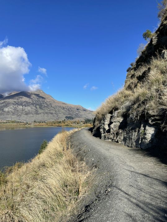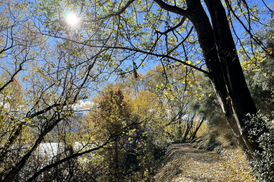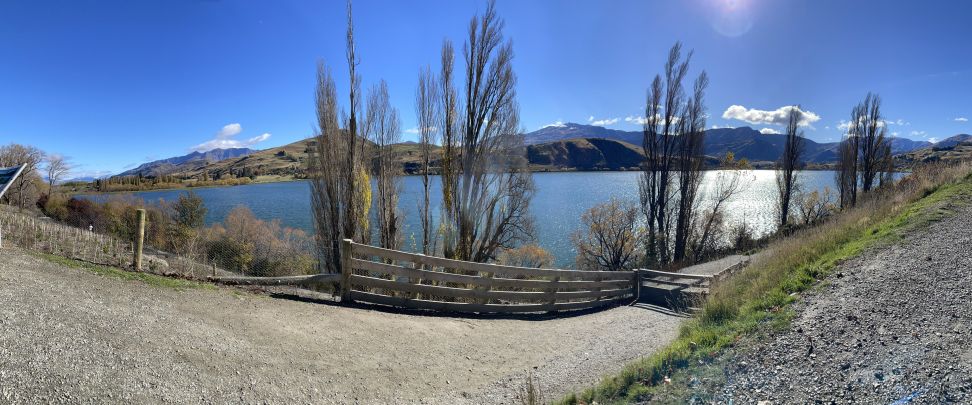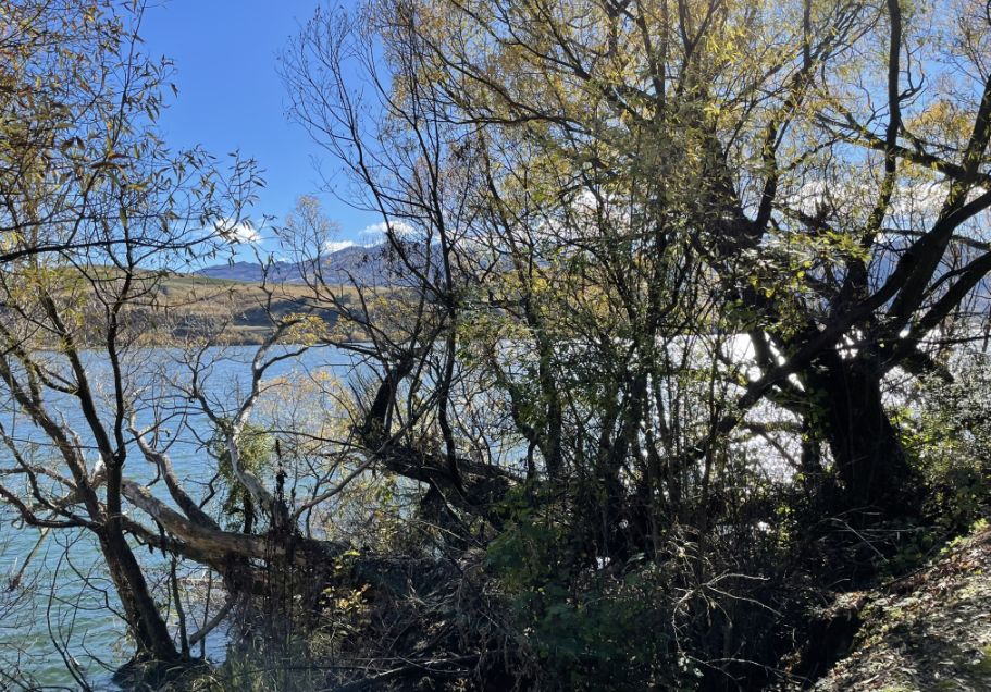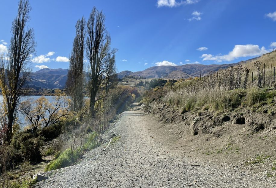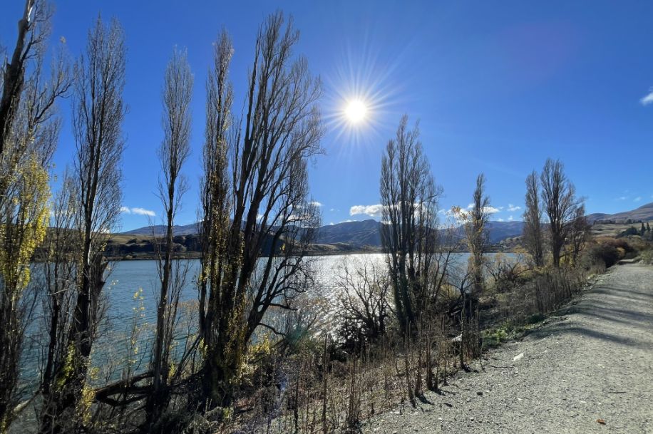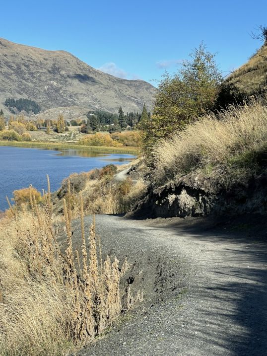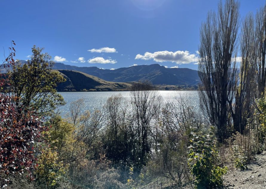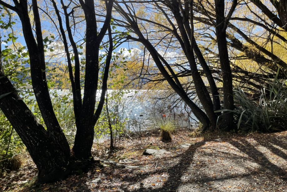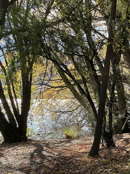Ahead, the trees begin to part, and through the gaps you glimpse the shore of Lake Hayes. T.
