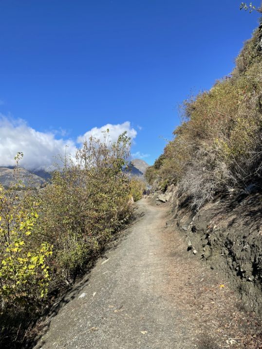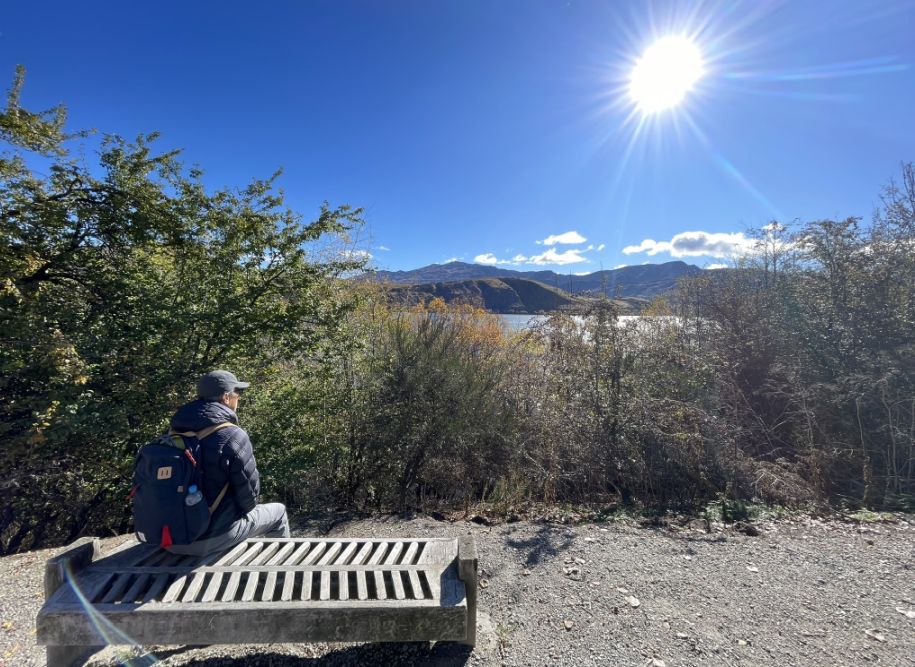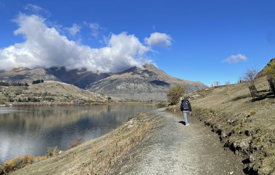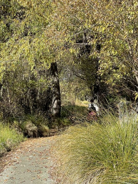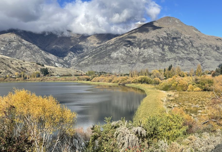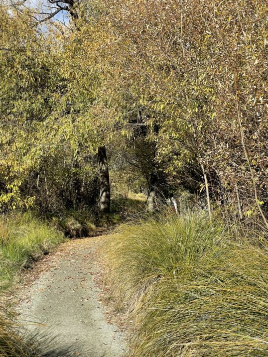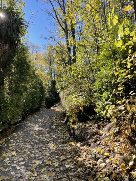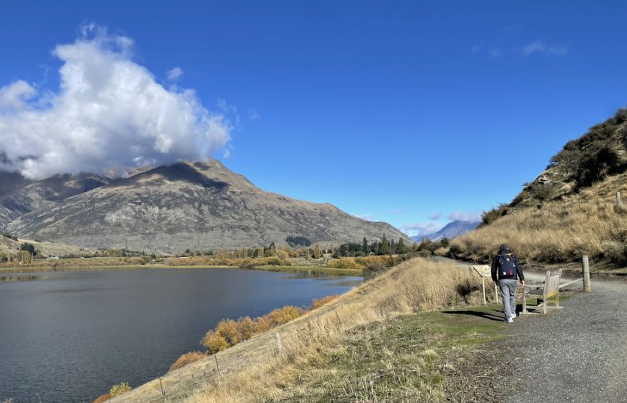 The whole loop around Lake Hayes took us about 4 hours, and walking in the fall is like stepping through a series of living paintings. The path winds through golden forests, willow tunnels, and open fields of tall grass, before rising to rugged hillsides with sweeping views of the lake and mountains. At the shore, reflections of fiery red and gold leaves dance on the water, while wooden bridges and boardwalks lead us across streams and wetlands. Each turn reveals a new scene, luxury lodges tucked into the hills, quiet groves with leaves carpeting the ground, or trees leaning into the lake itself. The mix of changing landscapes, from tranquil waters to glowing forests, makes the walk especially breathtaking in the fall.