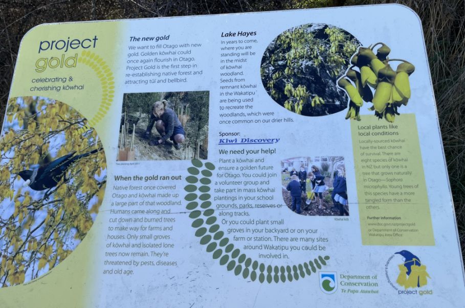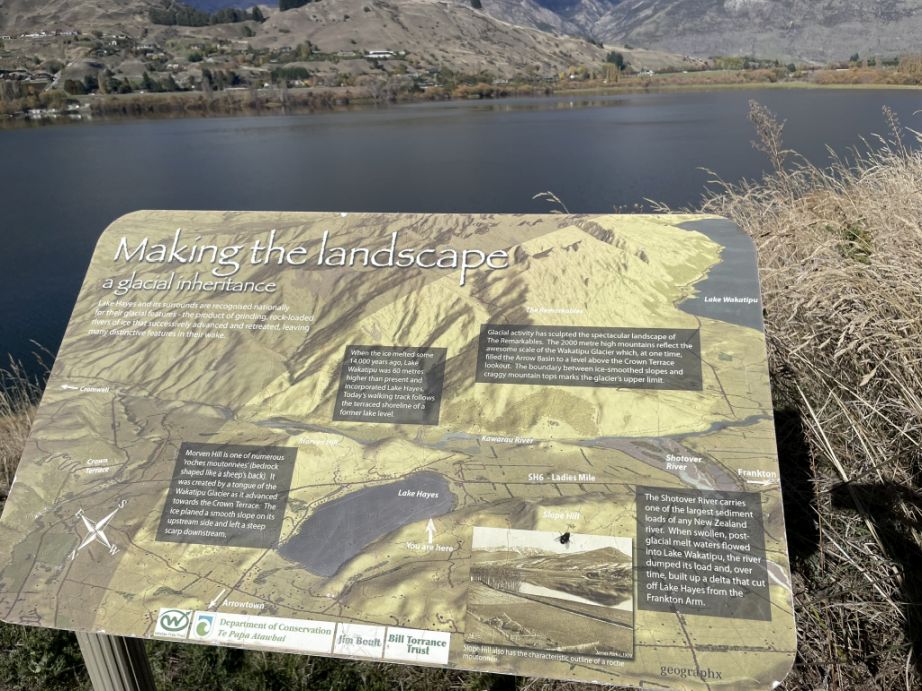 Info panel about Lake Hayes and its surrounding are recognized nationally for their glacial features which is the product of grinding, rock-loaded rivers of ice that successfully advanced and retreated, leaving may distinctive features in their wake.