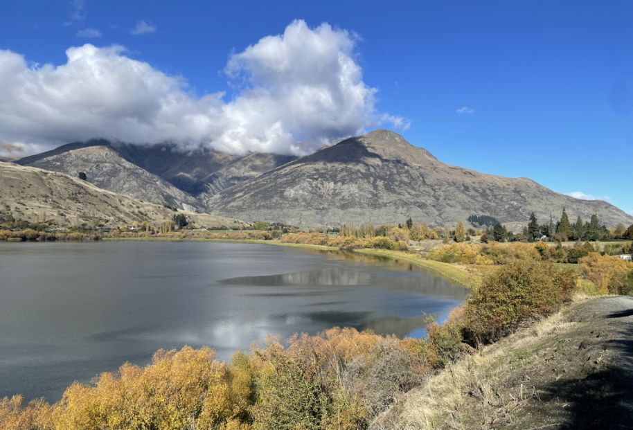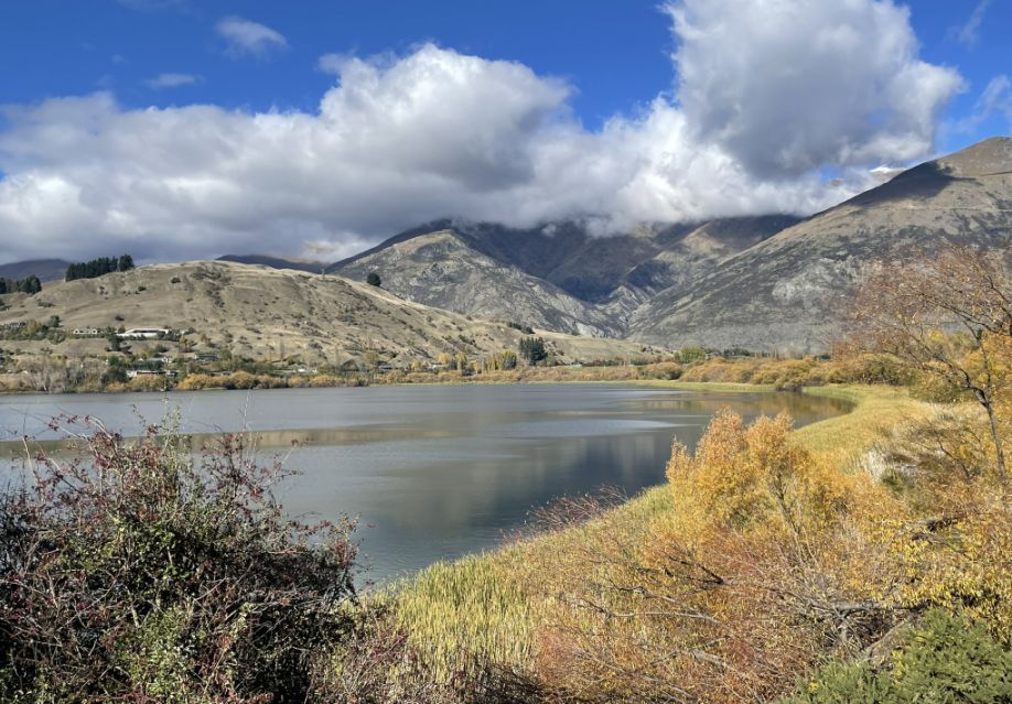 In the background, the mountains rise steadily, anchoring the scene with their quiet strength. The contrast of fiery leaves, shining water, and rugged peaks creates a breathtaking panorama, one that captures the essence of Central Otago’s landscapes, vivid, dramatic, and timeless. Standing here, it feels as if the entire walk around the lake has built up to this moment of wide-open splendor, where nature’s colors and shapes all come together in perfect harmony.
