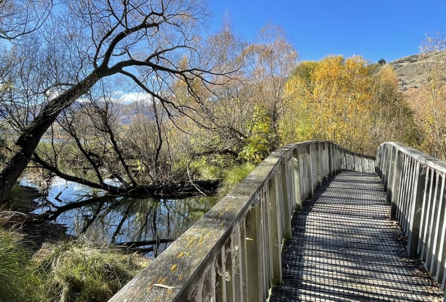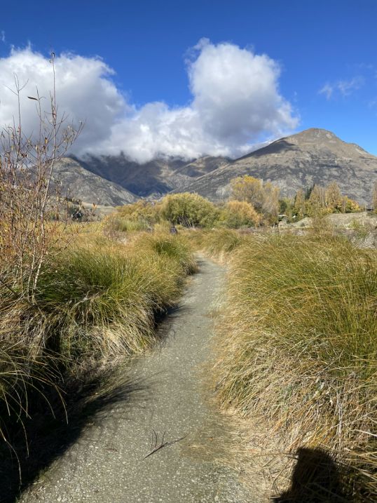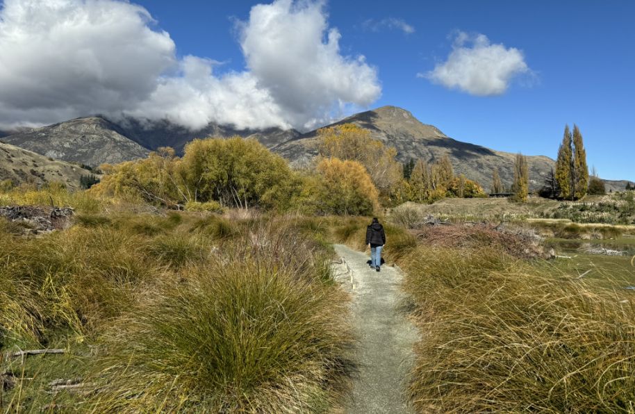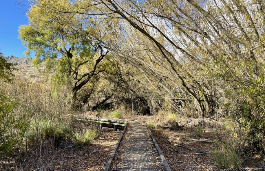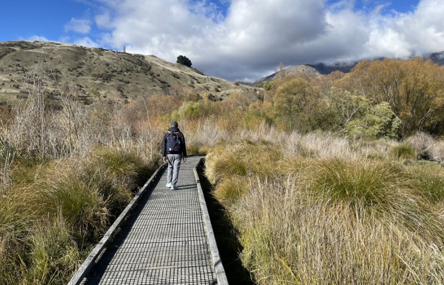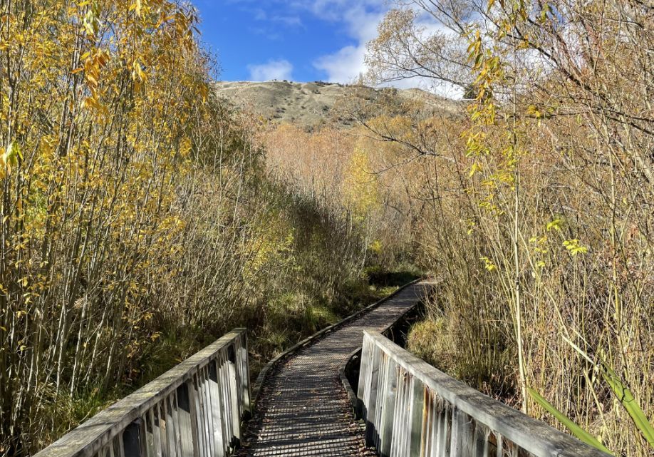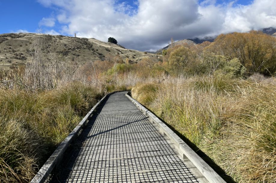 This kind of pathway is often built to protect the fragile wetlands around Lake Hayes, allowing visitors to experience the landscape without damaging the delicate plants and soil.