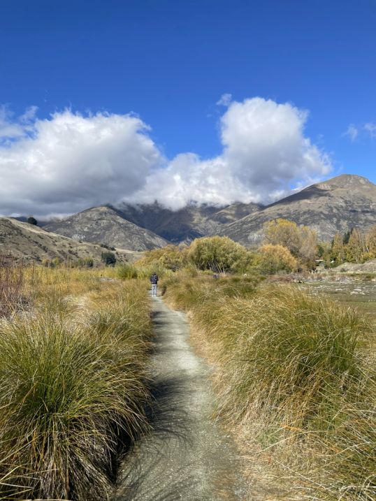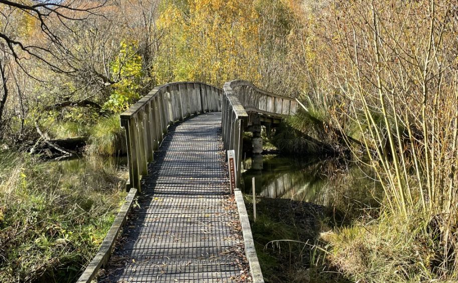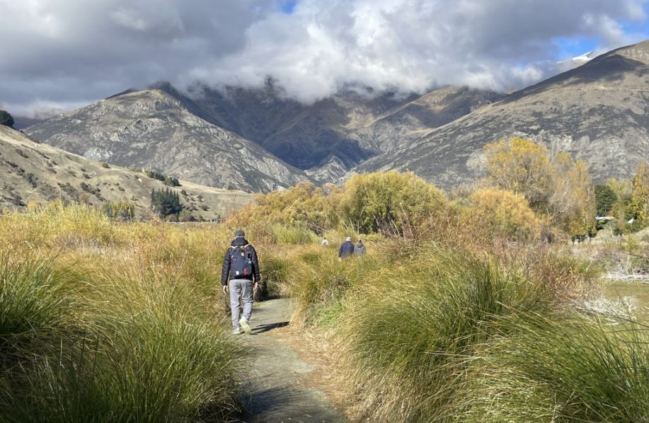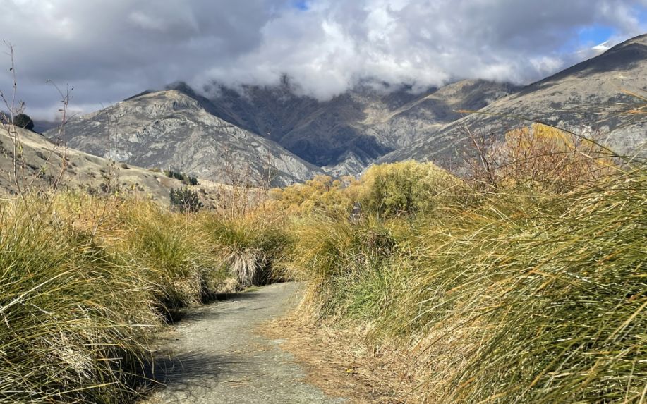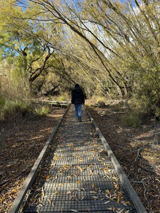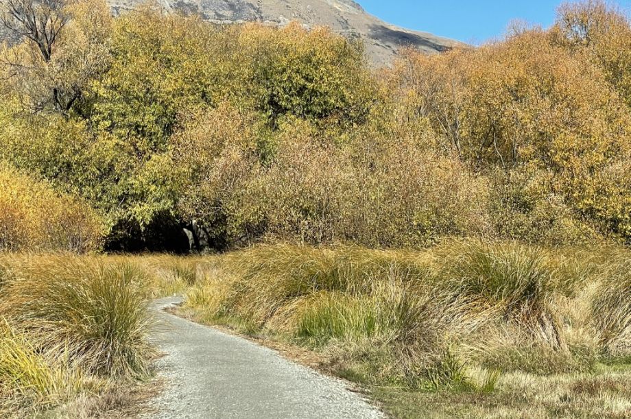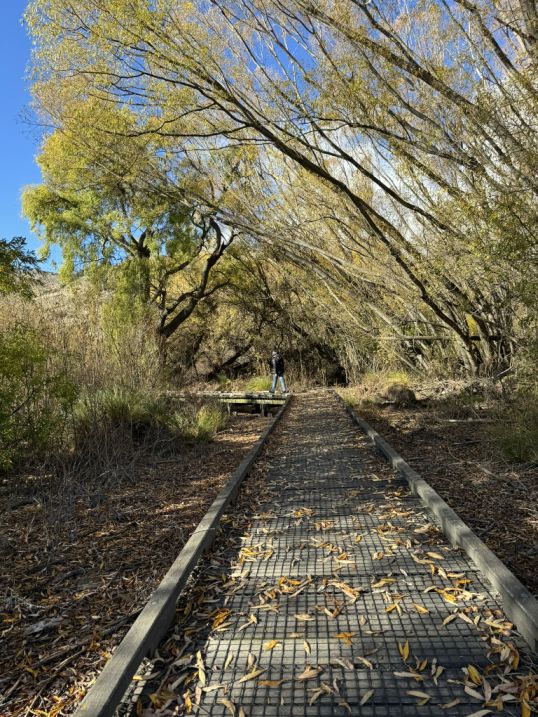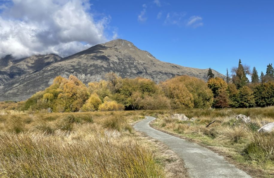 This kind of pathway is often built to protect the fragile wetlands around Lake Hayes, allowing visitors to experience the landscape without damaging the delicate plants and soil.
