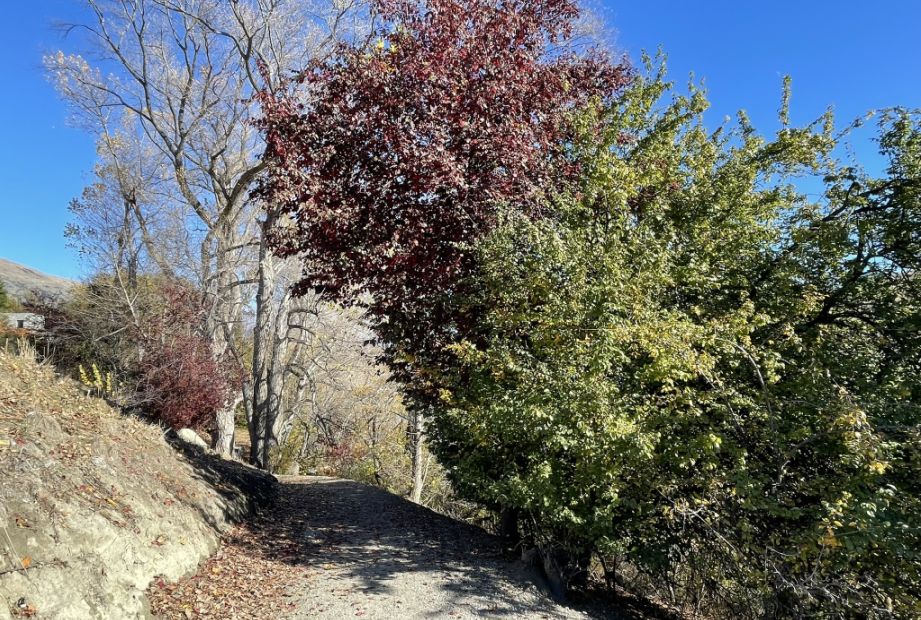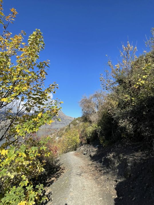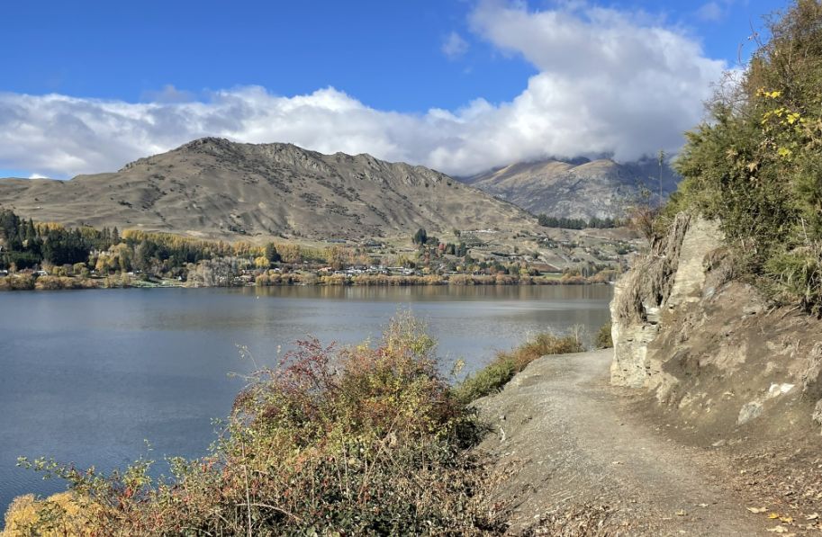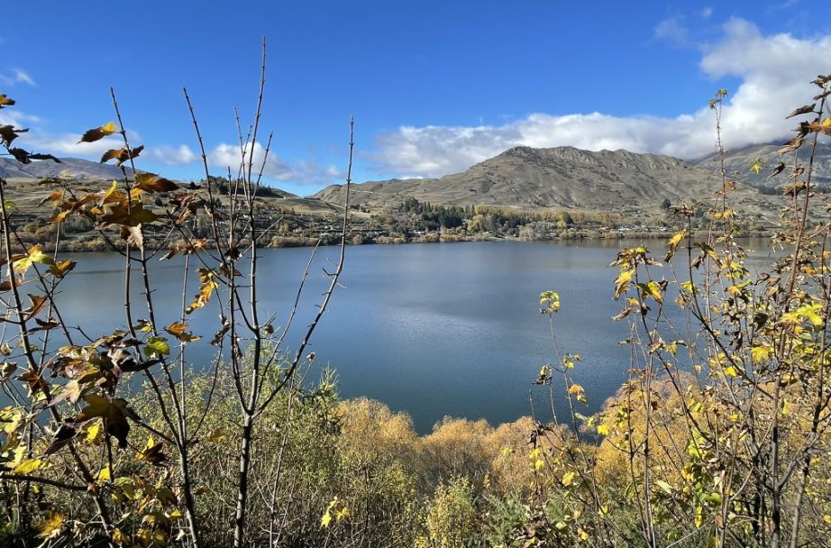 At this vantage point, where the trail bends and you can see the far curve of Lake Hayes, the view feels almost like a grand finale. The shoreline sweeps gracefully before you, edged with trees blazing in red and gold.