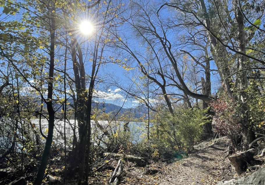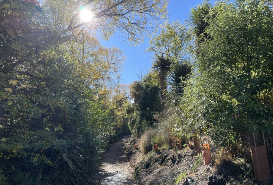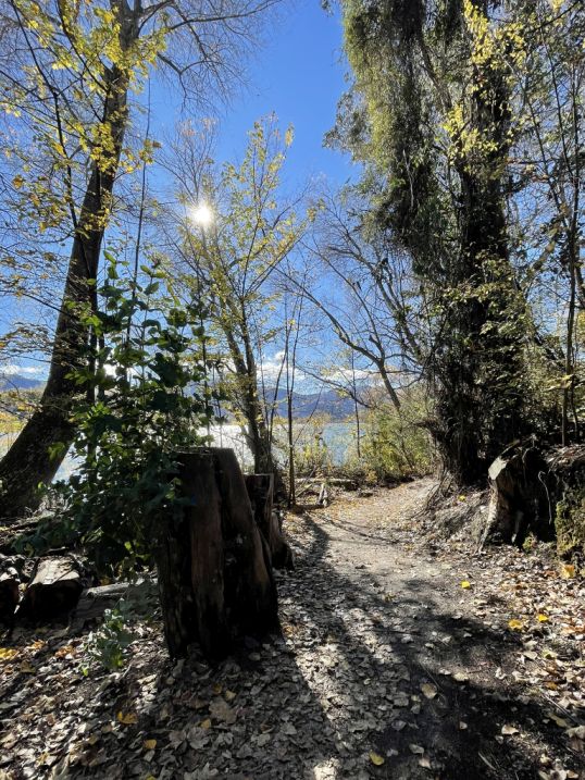 The sun is trying to break through the leaves and the trail is close to the shore of Lake Hayes.