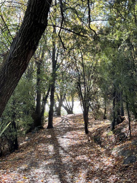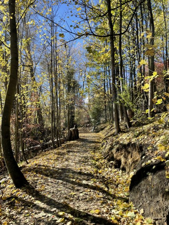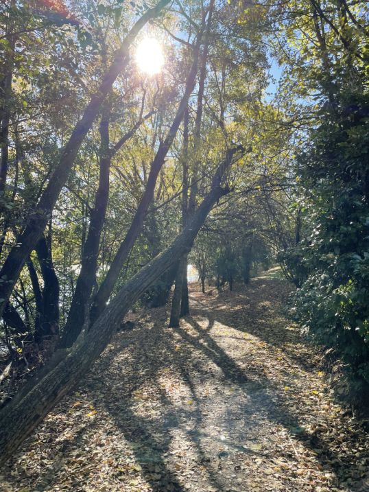 The trees lining the path with their golden leaves catching the sun. The pathway feels almost framed by nature’s architecture with a combination of light, foliage, and open sky creates a magical atmosphere, where every step feels like walking through a living painting.