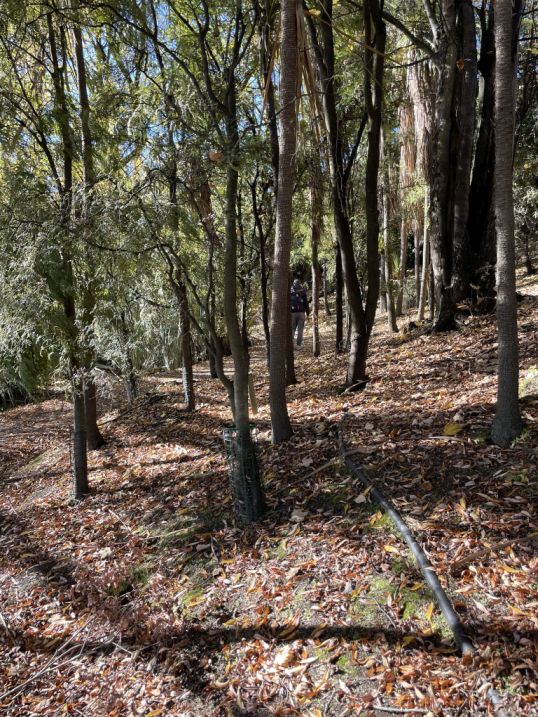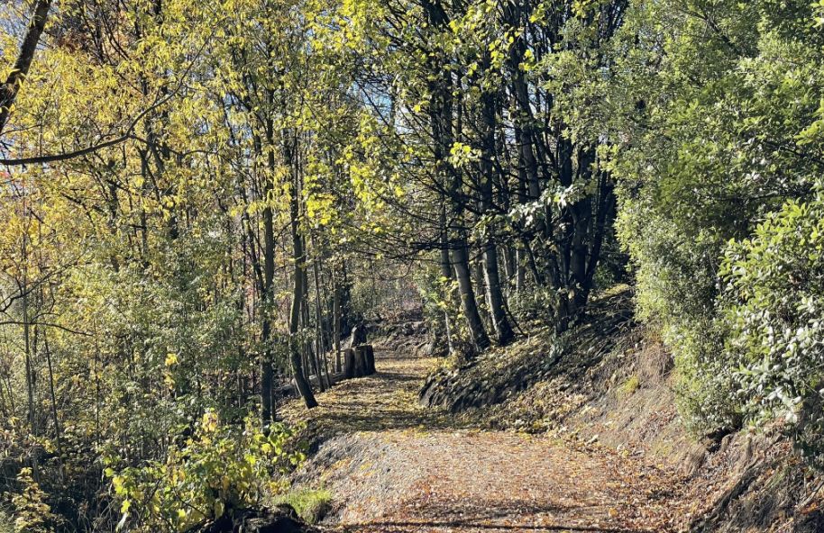 This stretch of the walk takes us onto a narrow pathway enclosed by trees. On the left we noticed rows of young trees, each carefully protected with paper bag coverings. These shelters are used to guard the saplings from frost, wind, and browsing animals, giving them the best chance to grow strong. It’s a sign of how the area is being restored and cared for, blending conservation with recreation.