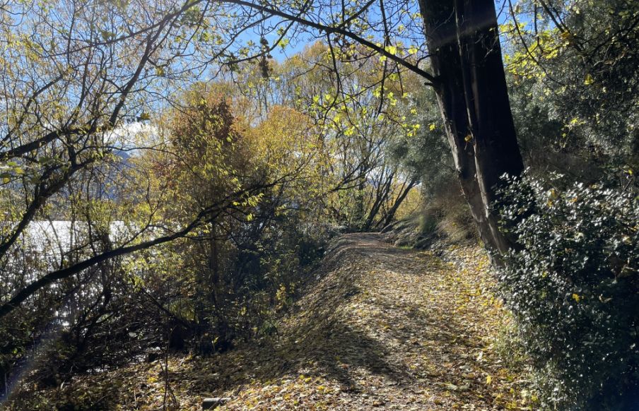 This portion of the walk takes on a more rugged character. The path clings to the hillside, and you feel the elevation as the ground drops away toward the lake on your left.