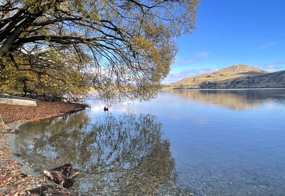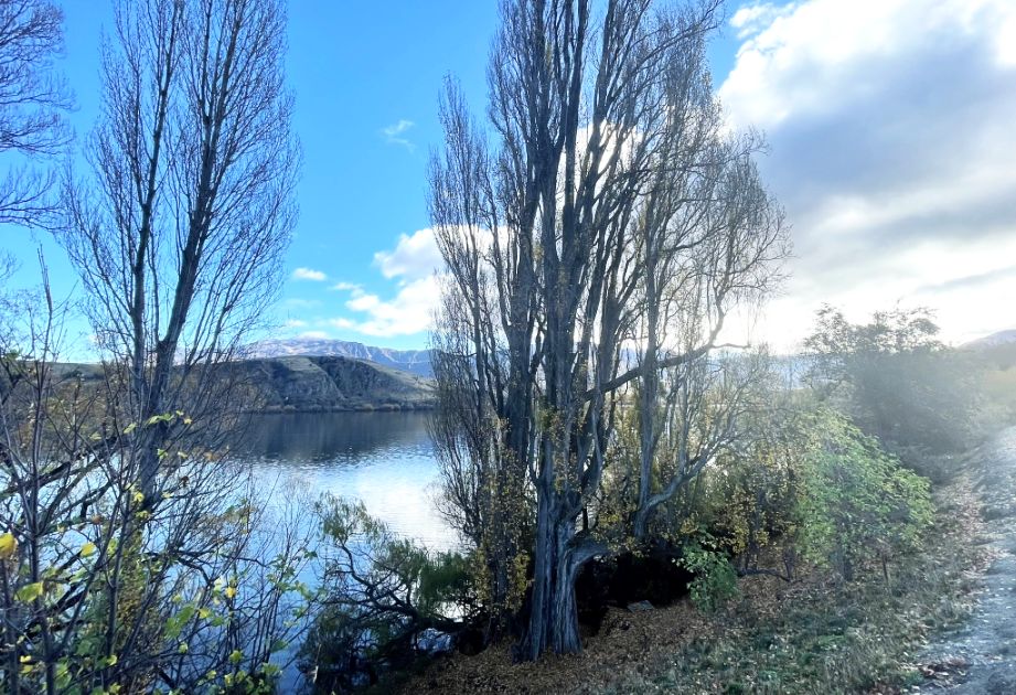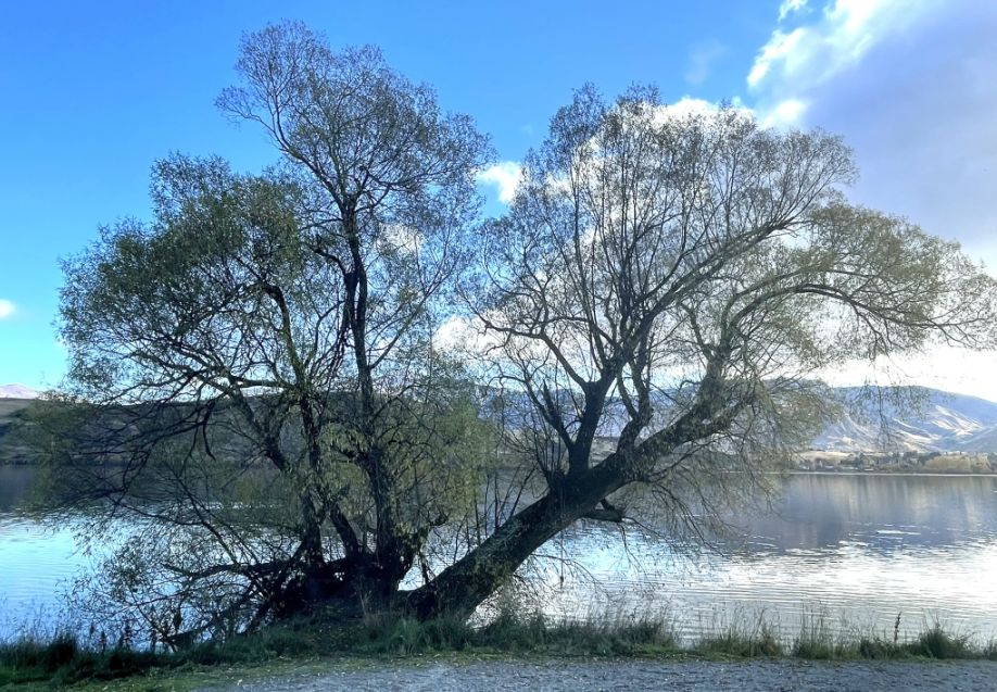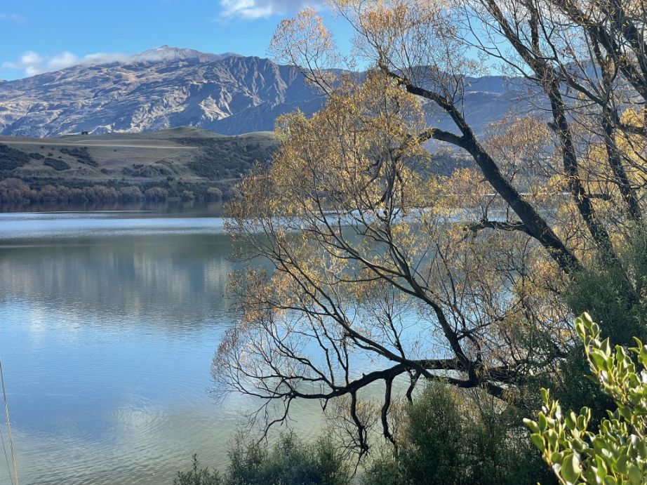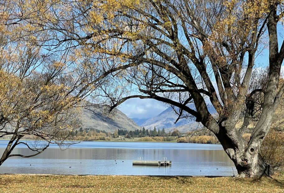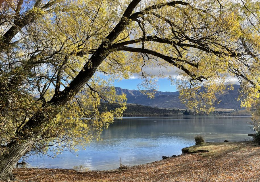 The trees you are seeing are probably willows or poplars, which are common around Lake Hayes’ shoreline. In the fall, their long, arching branches turn brilliant shades of gold and yellow, and many stretch right out over the water.