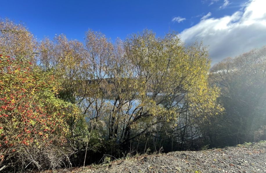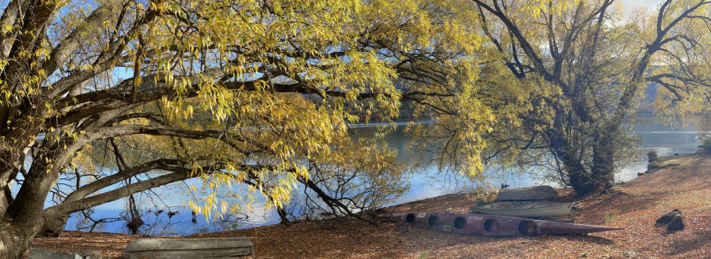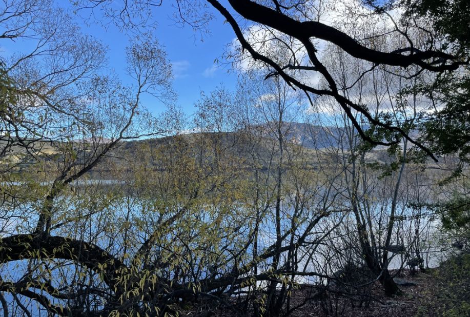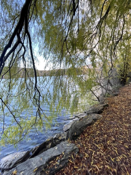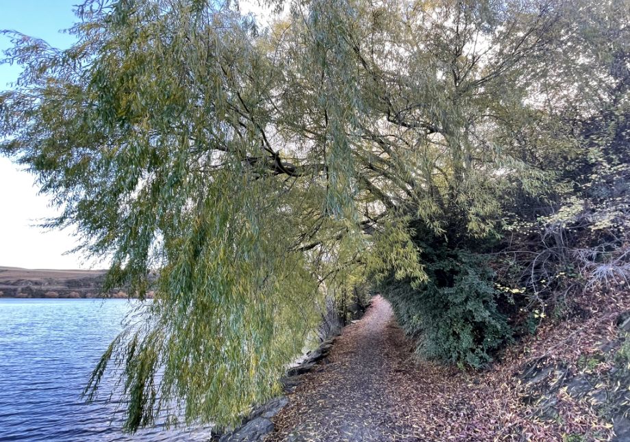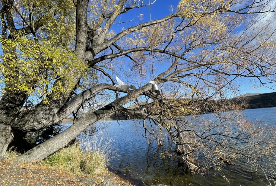 The trees you are seeing are probably willows or poplars, which are common around Lake Hayes’ shoreline. In the fall, their long, arching branches turn brilliant shades of gold and yellow, and many stretch right out over the water.