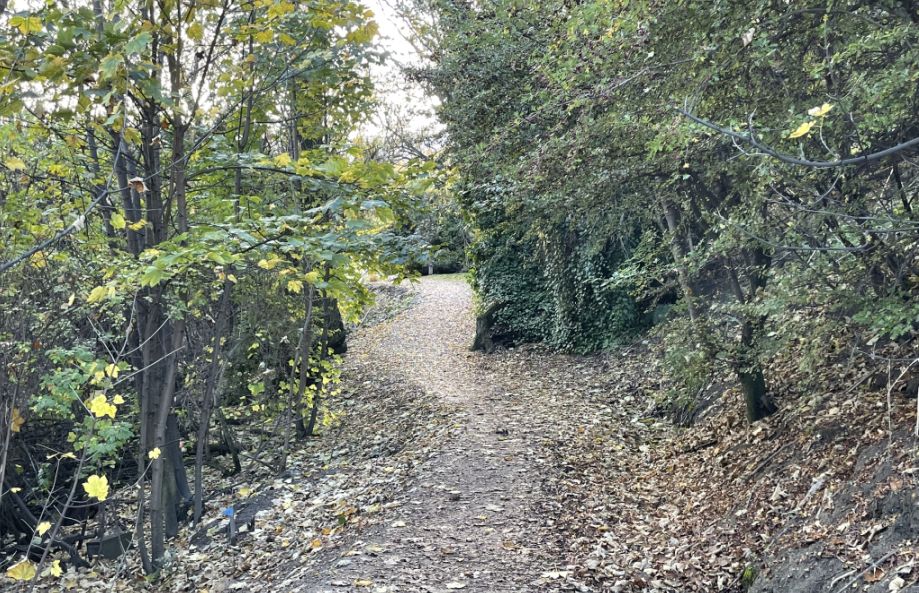 Dirt path lined with trees on both sidesof the walkway.