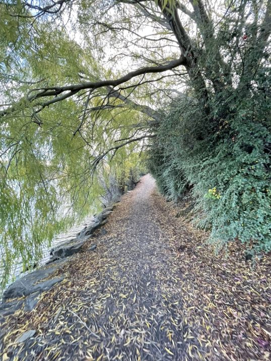 To your side, the shoreline runs close, we catch glimmers of the lake between the hanging branches. The water sparkles through the green-and-gold curtain of willow leaves, and the reflections shift with every step. It’s a place where the quiet rustle of leaves, the gentle lap of water, and the filtered light combine into a scene that feels both magical and timeless.