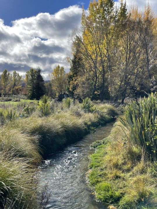 The paths led us to another stream feeding into Lake Hayes, its waters weaving gently through the reserve before merging with the lake. Unlike the calm reflections on the main shoreline, this stream feels wilder, with fallen tree trunks and branches scattered across its course. Some lie half-submerged, bleached by water and time, while others jut out like natural sculptures, shaping the flow of the current.