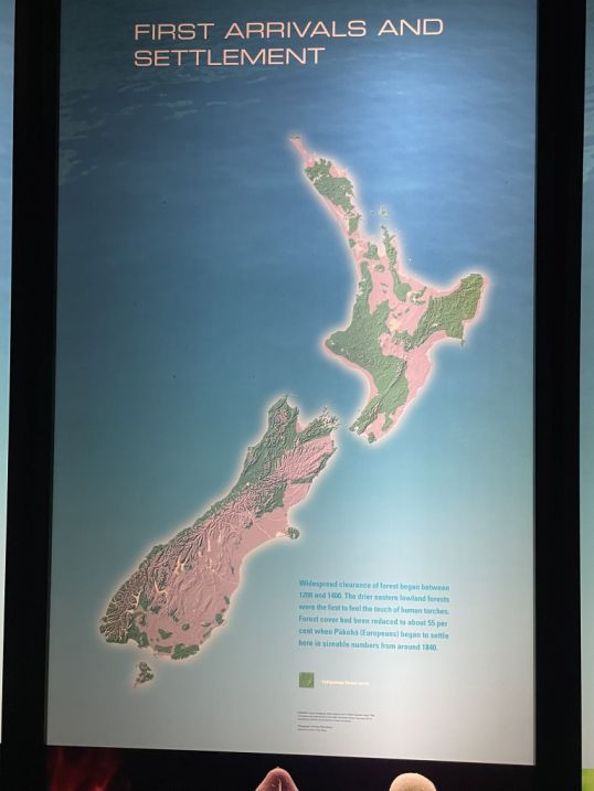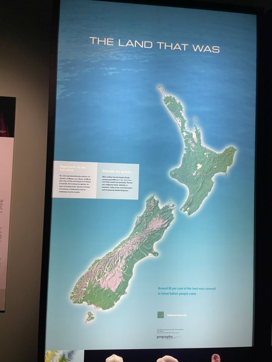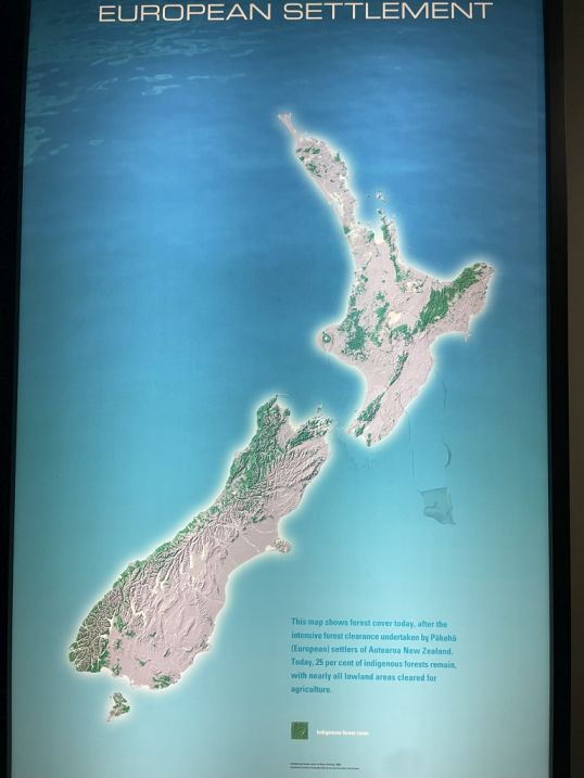 The map shows forest cover today, after the intense forest clearance undertaken by Pakeha (European) settlers of Aotearoa New Zealand.