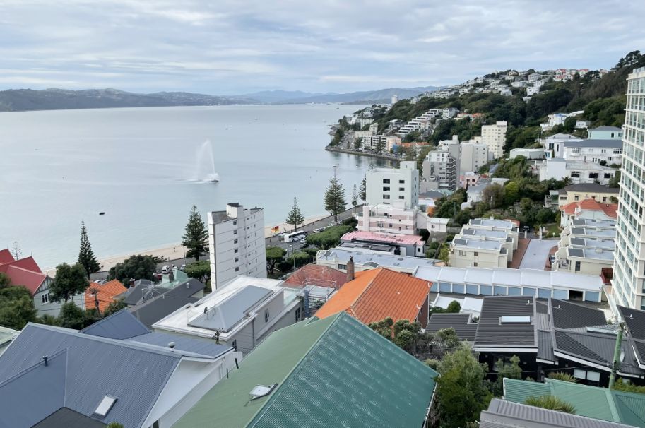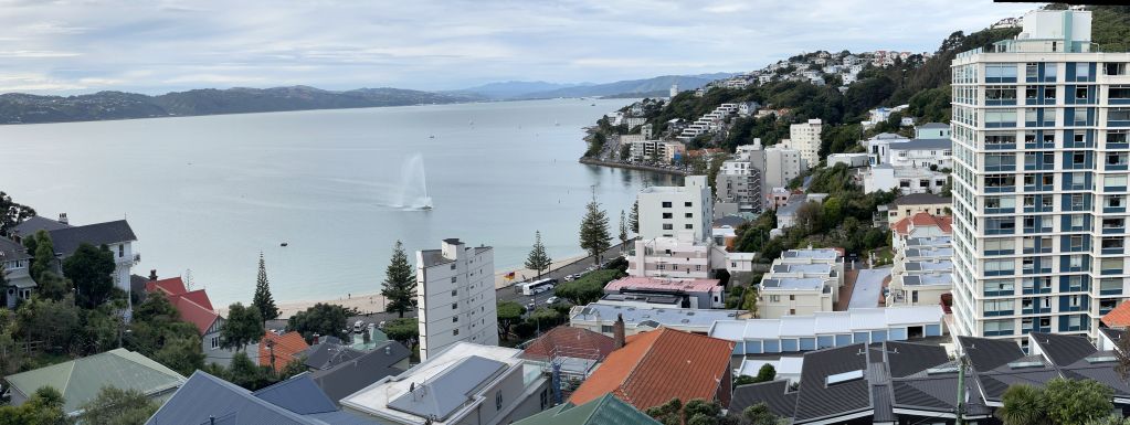 Rooftop in front of the Oriental bay. Notice the Water jet in the bay.