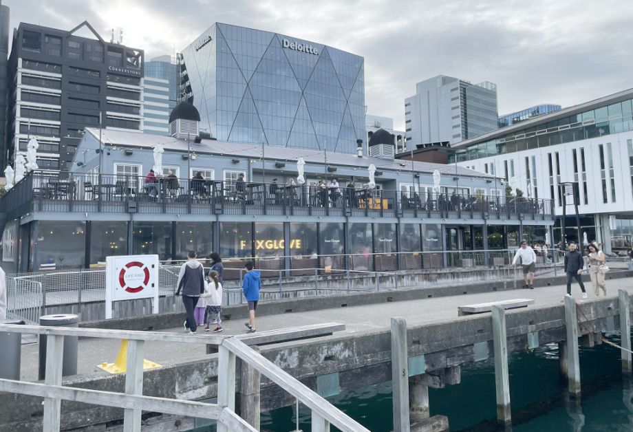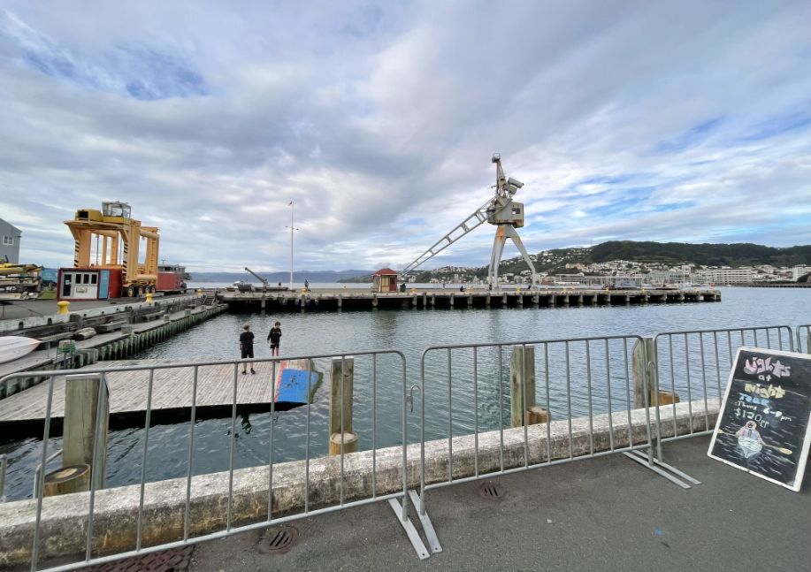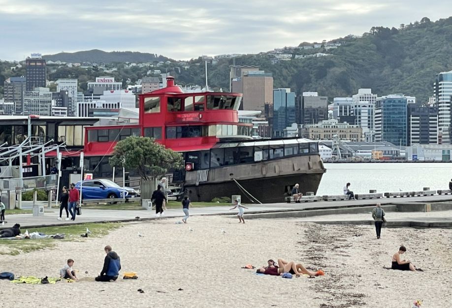 Ahead is the “Boat Café”, a well-known floating café and restaurant housed inside a bright red ship moored in Freyberg Lagoon, right on the Oriental Bay waterfront in Wellington.