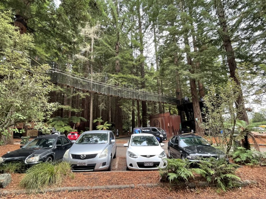 Parking lot before entering the Whakarewarewa Forest. The forest is also a place where people can enjoy and explore the forest environment through various recreational activities such as biking Treewalk with sits at 65 ft. above the ground floor. Here you can see one of the 28 suspension bridges that traverse between 27 majestic 117-year-old Redwood Trees.
