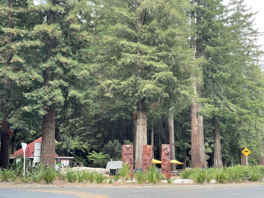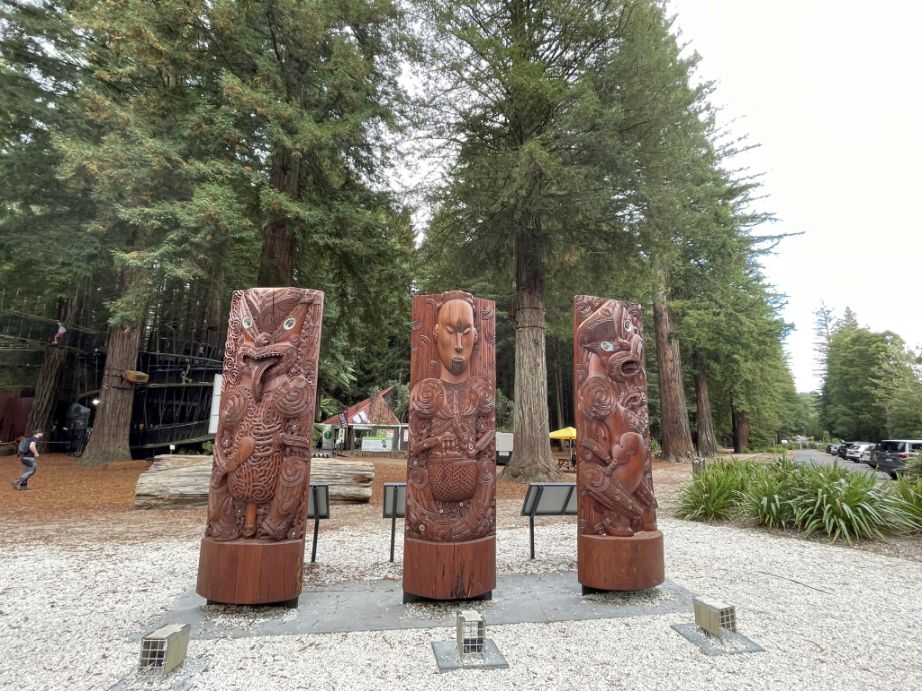 At the entrance to Whakarewarewa Forest stand three large wooden statues. These towering figures are traditional Māori carvings, known as pou, which serve as guardians and storytellers, embodying the rich cultural heritage of the area.