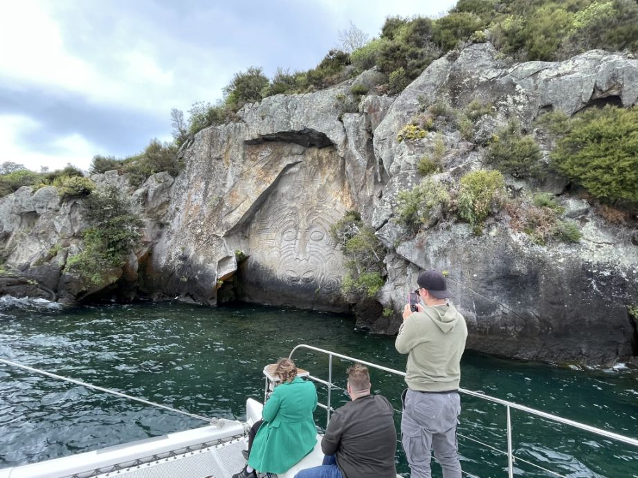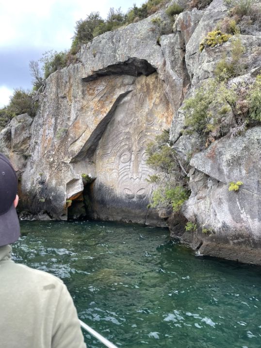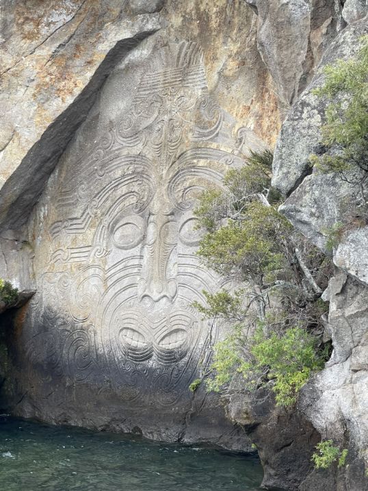 We are now approaching the Maori rock carvings of a height of 33 ft. tall. The carvings depict Ngātoroirangi, a high priest and navigator who guided the Te Arawa people to Aotearoa (New Zealand) from Polynesia over 600 years ago. He is a spiritual ancestor of the Ngāti Tūwharetoa iwi (tribe), whose rohe (territory) includes the Taupō region. The image shows him with a calm, powerful expression, representing wisdom, guardianship, and connection to the land and water.