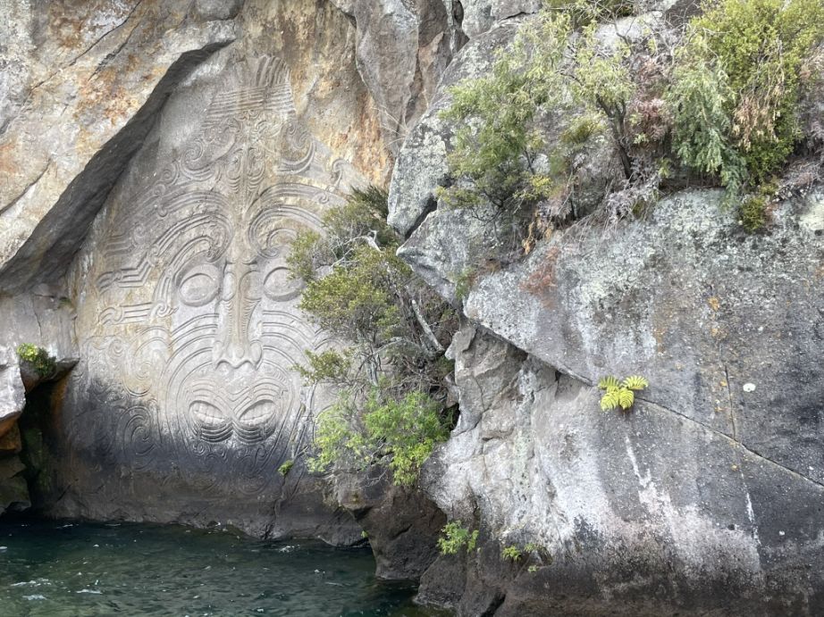 Māori rock carvings at Mine Bay on Lake Taupō are one of New Zealand’s most remarkable modern cultural landmarks. Though they look ancient, they’re actually a contemporary work of art with deep traditional meaning.