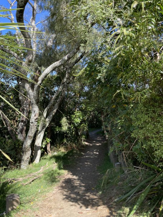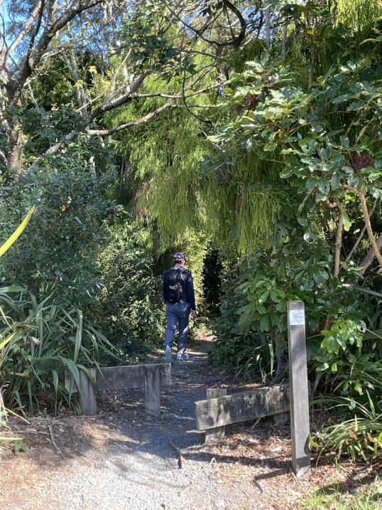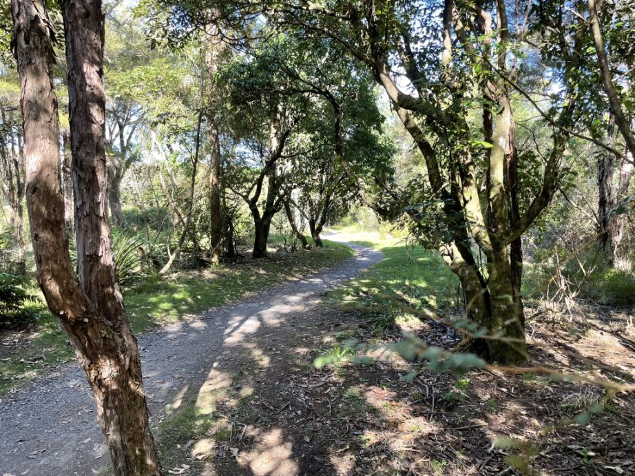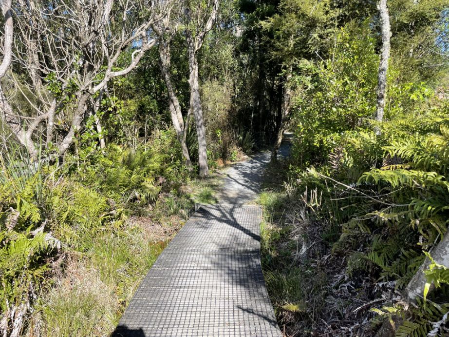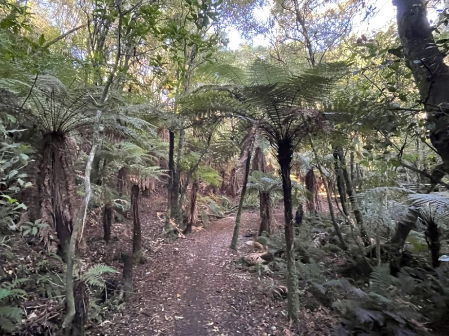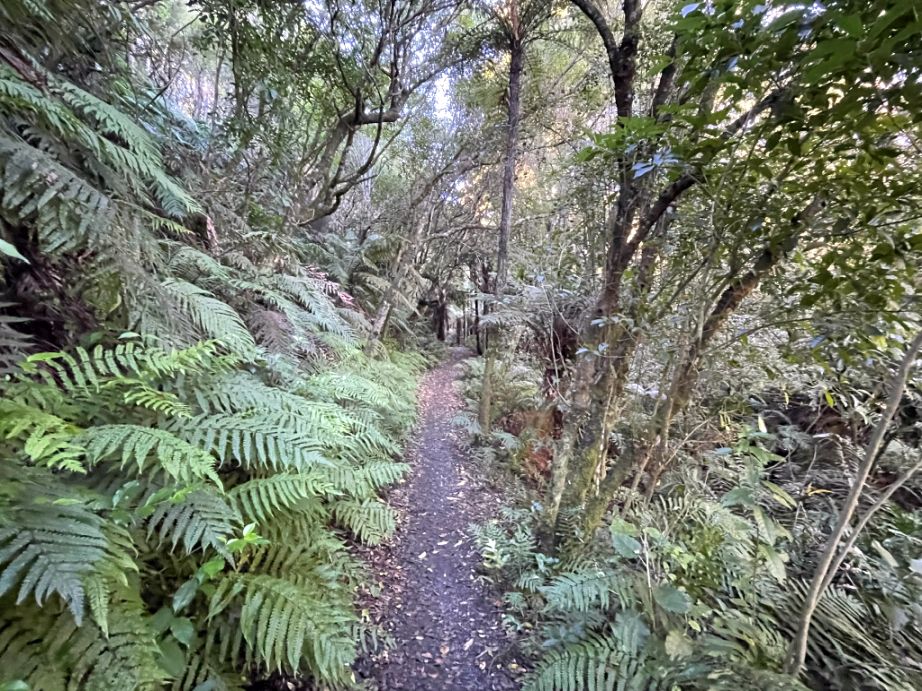 .After crossing the highway, the trail picks up again and continues into native bush, eventually looping toward the Red Hut Bridge side of the trail.