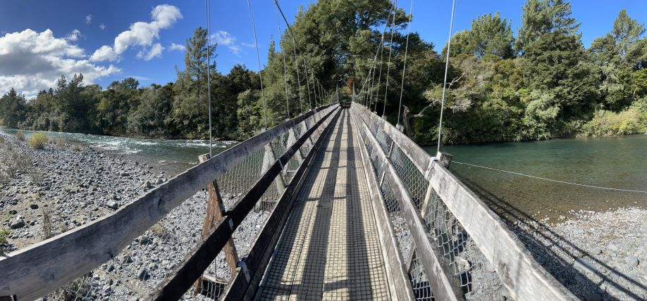 Red Hut bridge located at the southern end of the trail. It is a picturesque and historically significant part of the Tongariro River Trail, and it’s closely tied to the area's renowned fly fishing culture. It’s a sturdy, modern swing bridge but retains a rustic character, blending well with the surroundings. The name comes from the nearby Red Hut, a historic fishing lodge originally used by anglers in the early 20th century.