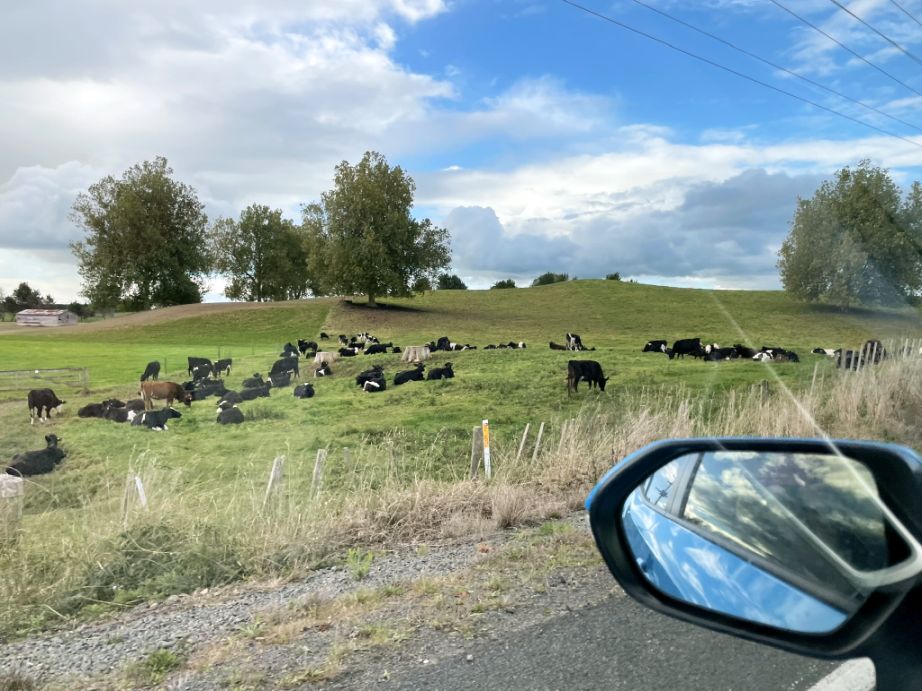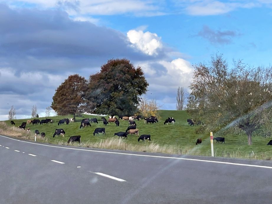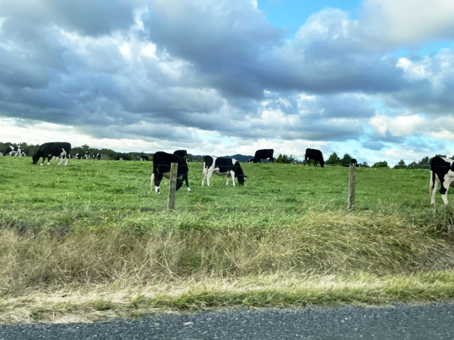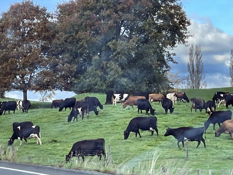 The cows have a good life here. New Zealand have so many green pastures for the cows to run around.
