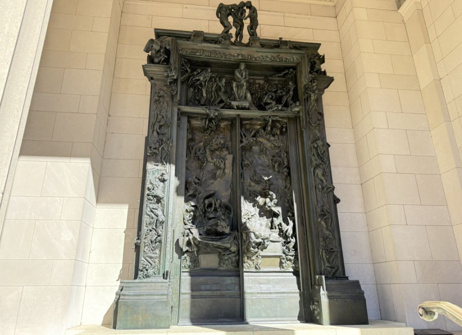 The gates are intense and dramatic, contrasting with the calm symmetry of the building and reflecting pool. The entire approach is theatrical: water → symmetry → classical façade → emotional, chaotic sculpture. It’s meant to move you from tranquility into contemplation.