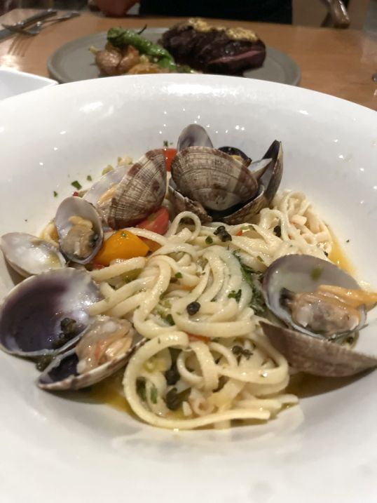 For our main dishes, we shared the shrimp puttanesca linguine, rich and savory with Castelvetrano olives, capers, Calabrian chili, and tomato, bold, briny, and comforting all at once.
