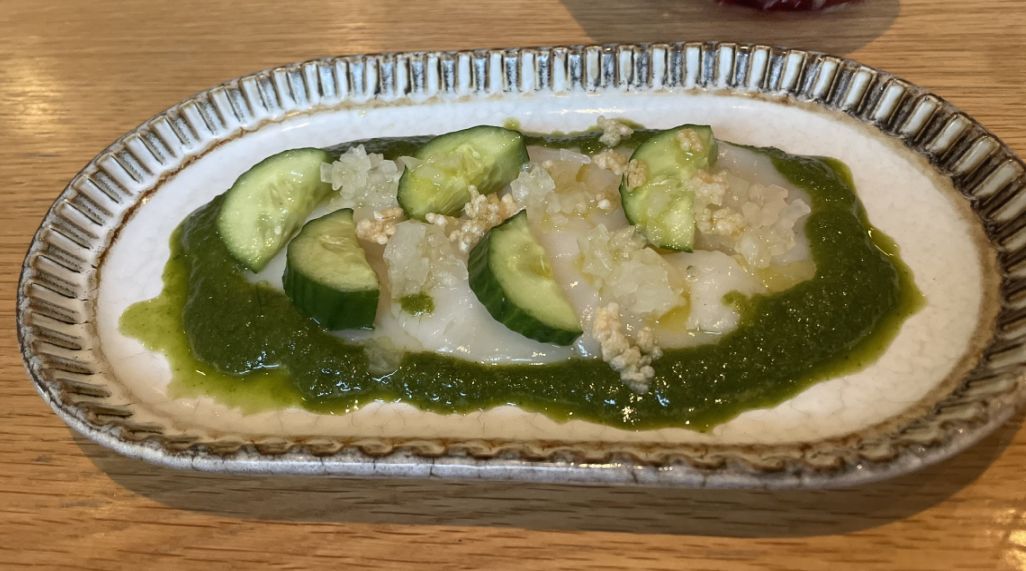 We started with the hamachi crudo, delicately sliced and brightened with fresh cucumber, crunchy bits of crispy rice, and a jalapeño-cilantro emulsion that tasted like a vibrant, herb-forward salsa verde. It was light, fresh, and quietly complex.