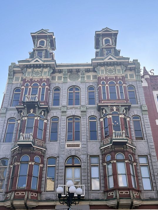 On the left is the Louis Bank of Commerce featuring beautiful arched windows and intricate detailing that made it a symbol of luxury and progress during the 1880s boom. It primarily houses creative office spaces and high-end retail on the ground floor.