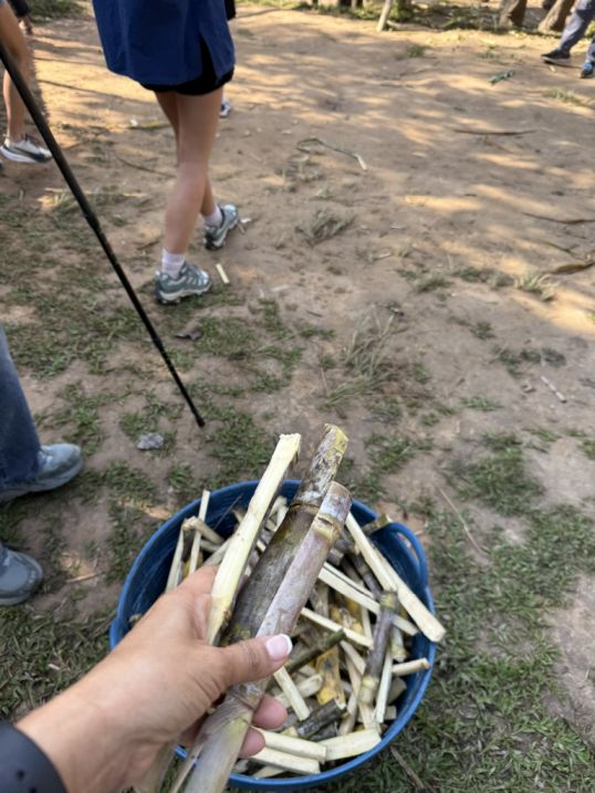 Nearby, our guide organized the group and asked for a few volunteers to help carry baskets filled with cut sugar cane. Each piece had been trimmed into long sticks, easy to hold and offer.