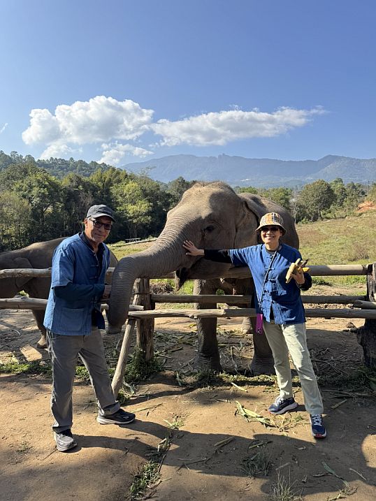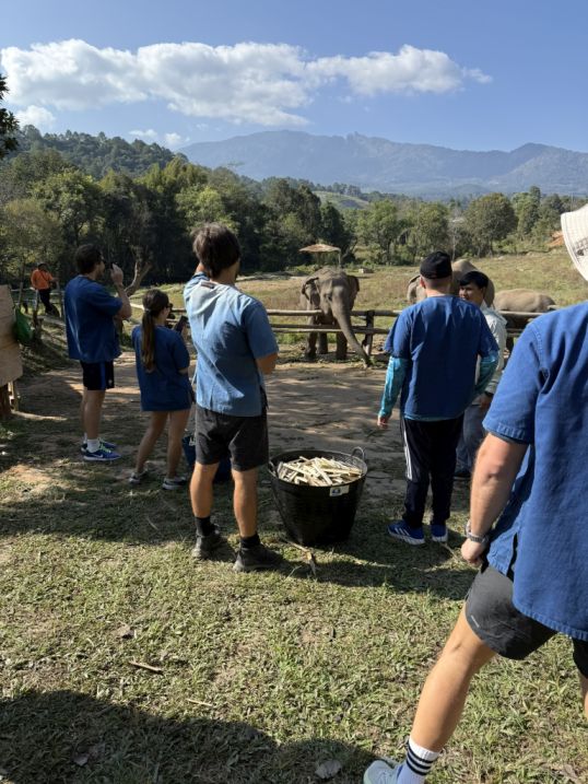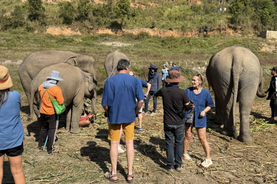 Our tour guide gave us a blue shirt, and we all put on a simple “mahout-style” clothing (like a blue jacket) to create a sense of immersion. Our tour guide explaining how they take care about the elephants and history before letting us interact with the elephants. He also explained that “Ethical” elephant tourism has become a major shift in Thailand over the past decade. For many years, elephants were used in logging and later in tourism, especially for rides, performances, and entertainment. However, growing awareness of animal welfare has changed traveler expectations, and many travelers began avoiding riding camps, which is why our guide mentioned that the business is no longer viable. Sanctuaries like one emerged as an alternative livelihood for retraining camps into rescue and care centers.