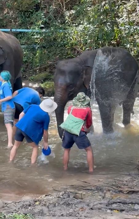 The elephants stood there, soaking it in, sometimes still, sometimes shifting slightly, while water glistened across their bodies. It felt playful, almost childlike, yet grounded in something more meaningful: a shared moment between people and animals, simple and unhurried, set in the natural surroundings of the creek.