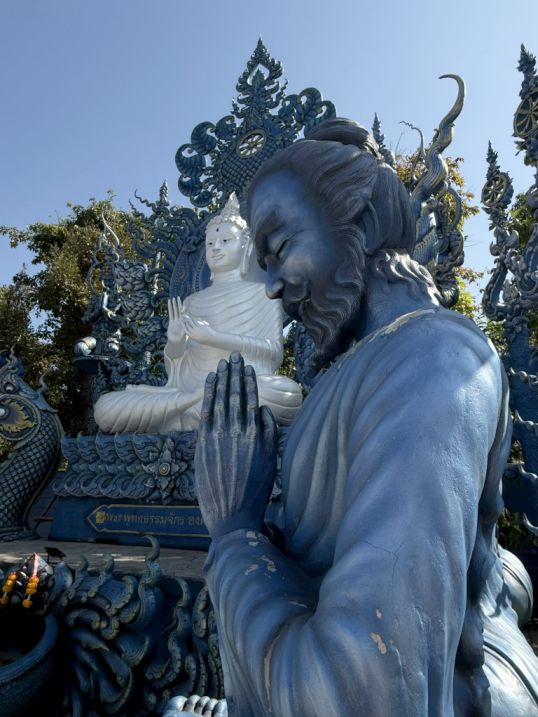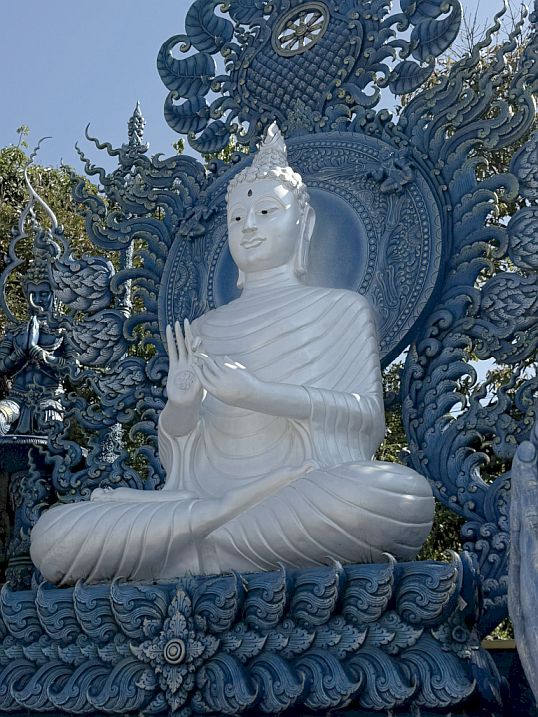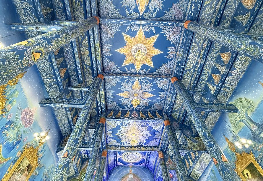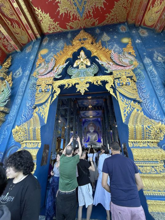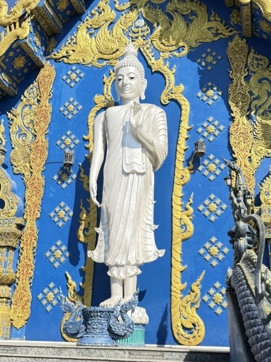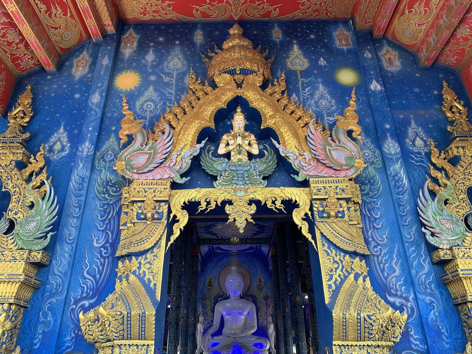 Unlike many ancient Thai temples, this one is relatively new. It was completed in 2016 and designed by local artist Putha Kabkaew, a student of Chalermchai Kositpipat, the visionary behind the White Temple. Interestingly, the site itself has older roots, there was once an abandoned temple here, and the name “Rong Suea Ten” means “House of the Dancing Tiger,” referring to wild tigers that were said to roam this area in the past. The temple’s deep sapphire blue color is what immediately sets it apart. In Thai symbolism, blue represents the Dharma, the teachings of the Buddha, and wisdom, as well as the vastness of the universe. The gold accents layered over the blue create a powerful contrast, symbolizing the material world illuminated by spiritual truth. That’s why at the entrance the golden facade against the rich blue background meant to evoke a sense of entering a sacred, cosmic space.
