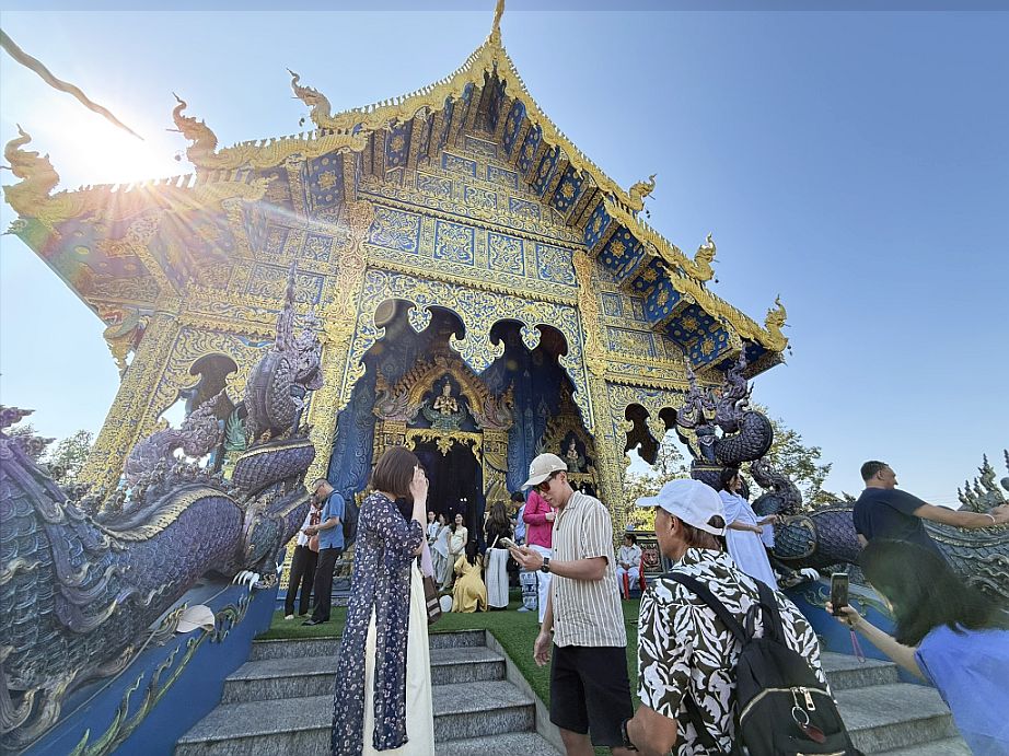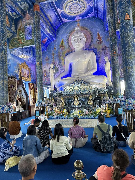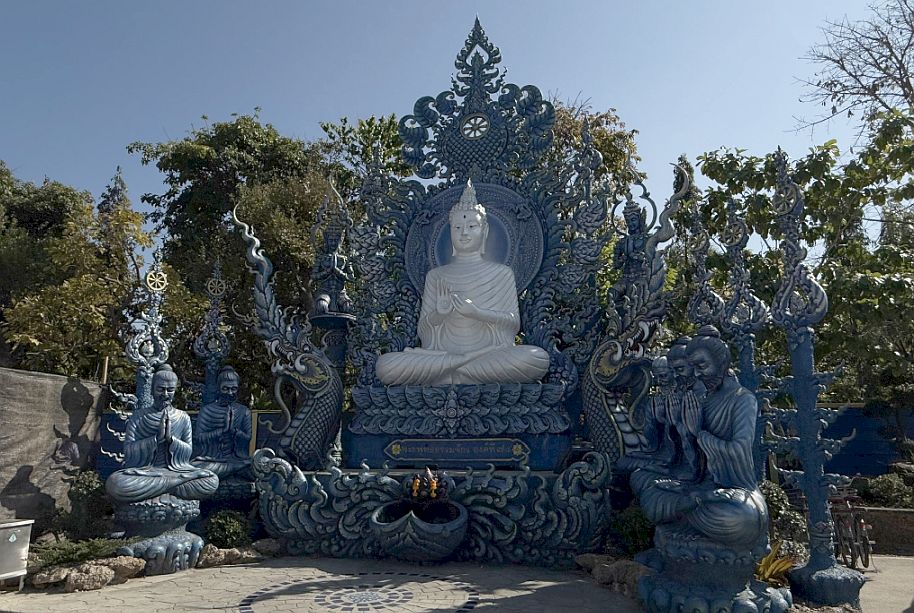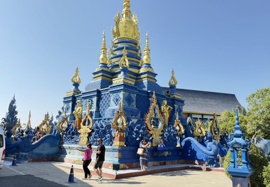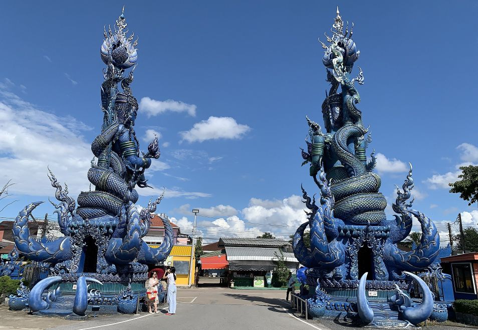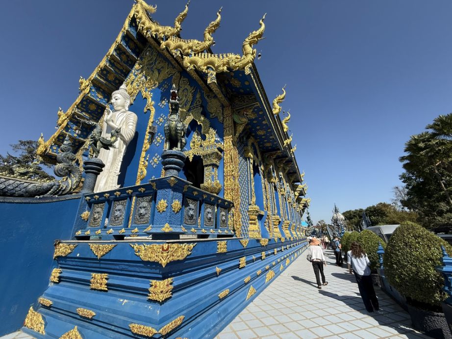 After leaving the White Temple, the short 20-minute drive brought us to one of Chiang Rai’s most striking modern landmarks, Wat Rong Suea Ten, commonly known as the Blue Temple.