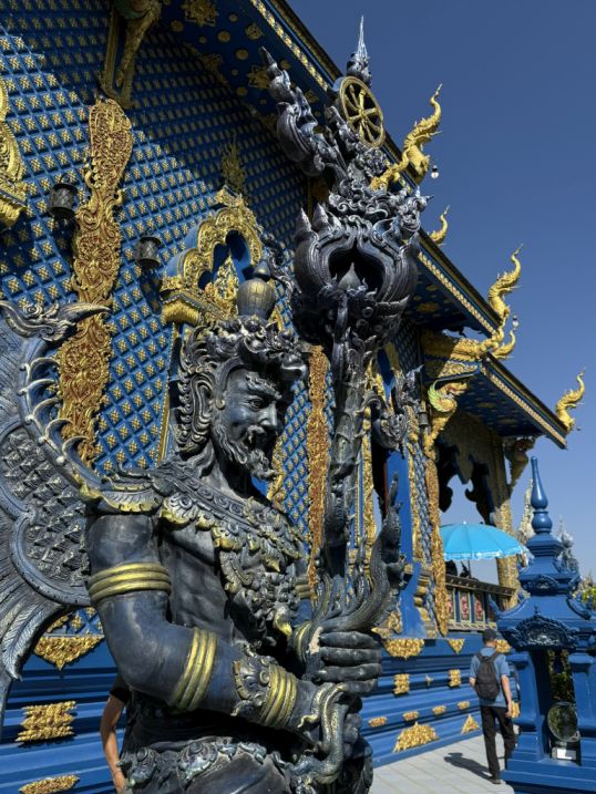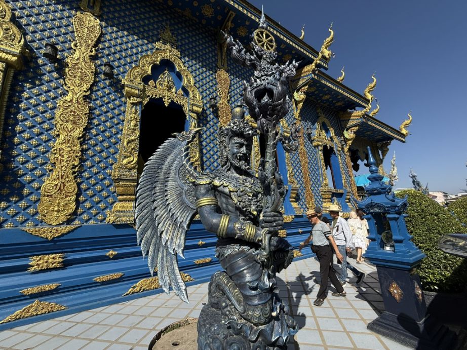 Placed along a quieter path, black statue of a winged being, which stands out strongly against the temple’s blue and gold palette. These figures are often inspired by creatures from Buddhist and Hindu mythology. A winged statue could represent a Garuda-like being. The Garuda is a powerful, eagle-like creature associated with strength, protection, and the triumph of good over evil. In Thai culture, Garuda is also a royal symbol, representing authority and divine power. When placed in temple grounds, such figures act as protectors of the sacred space.