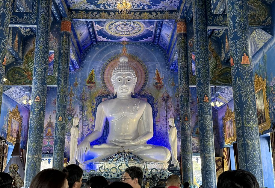 The contrast is striking, the interior is saturated in deep blue tones, with swirling, almost cosmic murals covering the walls, while the Buddha statue is pure white, glowing and serene.
