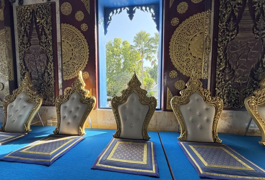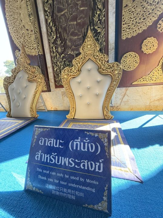 In Thai Buddhist practice, monks hold a highly respected position, and there is a clear hierarchy in how space is used. These reserved seats are typically arranged to face the Buddha directly and are set apart from where lay visitors sit. When monks are present, they sit here during chanting, ceremonies, or teaching.
