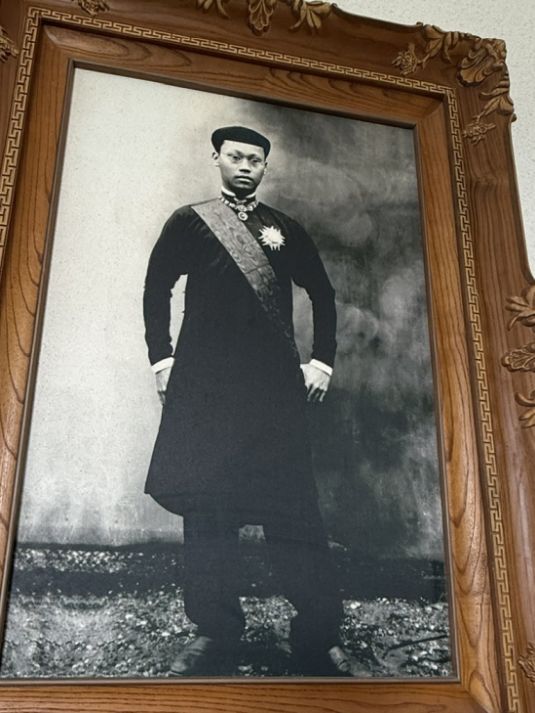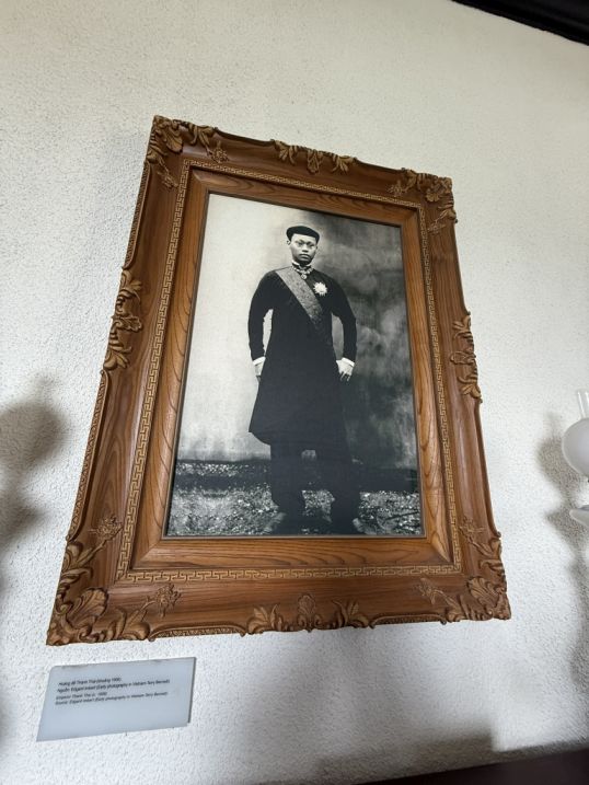 On the wall hung a portrait of Emperor Thành Thái from 1906. He is photographed standing in a black tunic, wearing a sash and a brooch, his posture composed yet resolute. Thành Thái was a ruler of the Nguyen dynasty who became known for his subtle resistance to French colonial rule. Although he reigned under the constraints of French control, he quietly opposed their authority, which eventually led to his forced abdication and exile. Because of this, he is often remembered as a patriotic figure who stood, in his own way, against colonial domination.