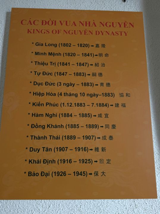 Another photograph of Emperor Thanh Thai wearing a traditional Vietnamese outfit, and on the right, a list of the Nguyen Dynasty.