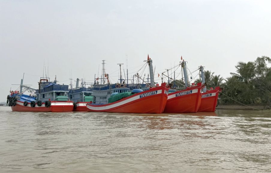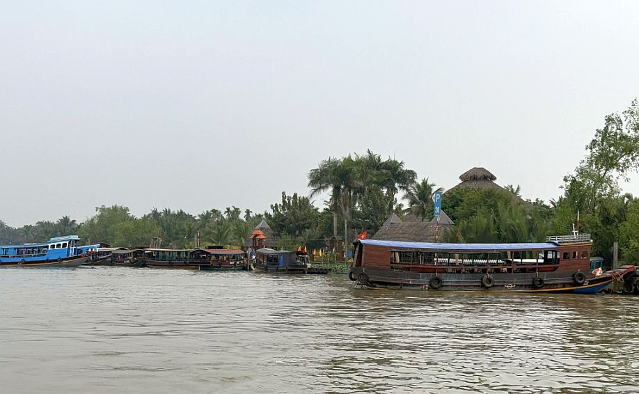 Nearby, the familiar blue-and-white wooden boats cluster together, these are the everyday workhorses of the Mekong, used for shorter trips, fishing, and ferrying visitors like you between stops. This area feels like a small river hub, where different types of boats gather before branching off into narrower waterways.