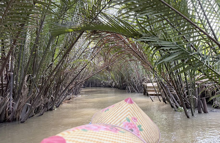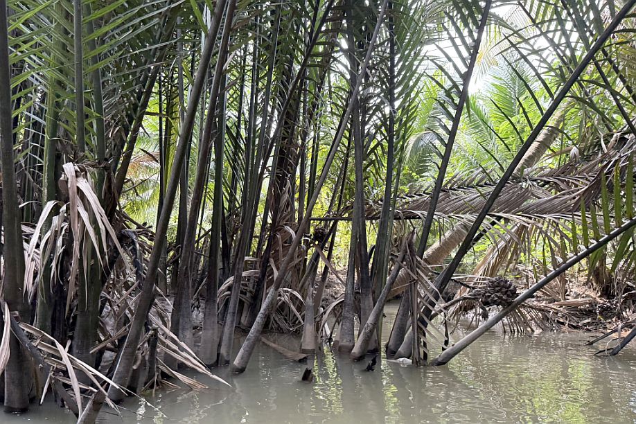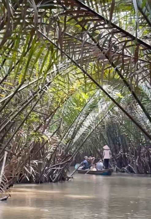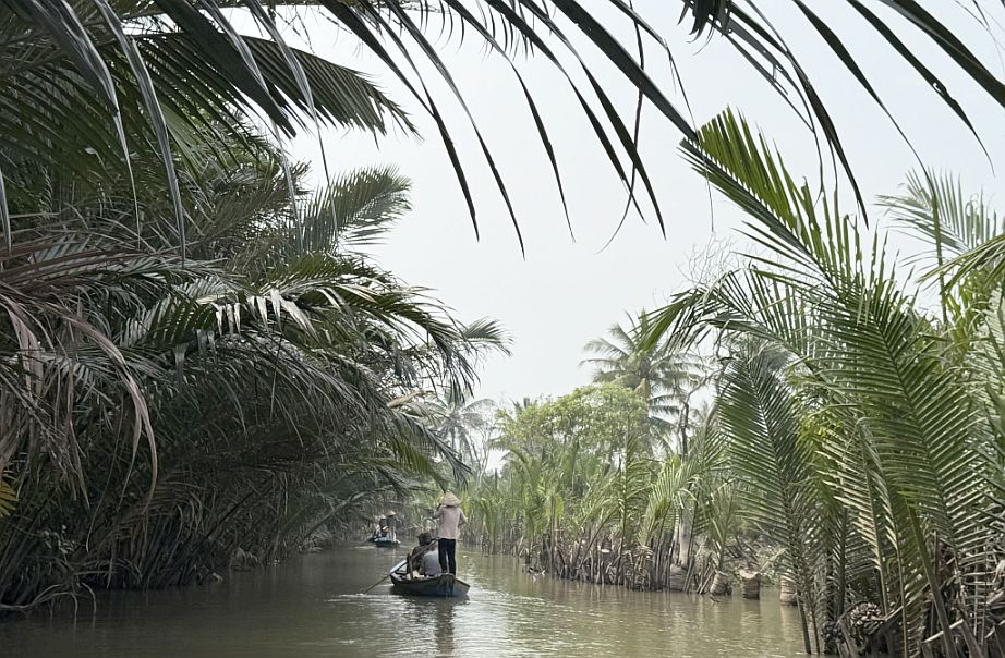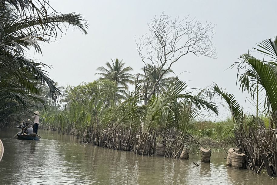 As our sampan glides deeper into the canals around Thoi Son Islet, the world feels quieter and more enclosed. The water coconut palms growing right out of the water line both sides of the canal, their roots hidden below the surface and their long fronds stretching outward. In many places, the trunks have been cut back, leaving short, weathered stubs rising from the water like natural markers of the tide and time.