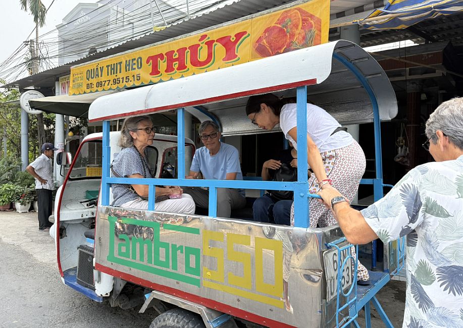 When we stepped off the boat, the shift back to land is immediate, and then comes another local experience, a small, improvised tuk-tuk–style vehicle. Unlike the ones you might see in cities, this version is more rustic: a motorbike or small engine pulling a rectangular open cart fitted with simple bench seating for about six people. Open on all sides, it lets the breeze pass through as you ride along narrow village paths.