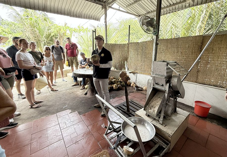 The short ride took us through more of the island’s everyday scenery, trees, small homes, and glimpses of local life before arriving at a coconut candy workshop like Lo Keo Dua Dat Dua. Here our group is gathering around our tour guide for a quick demonstration.