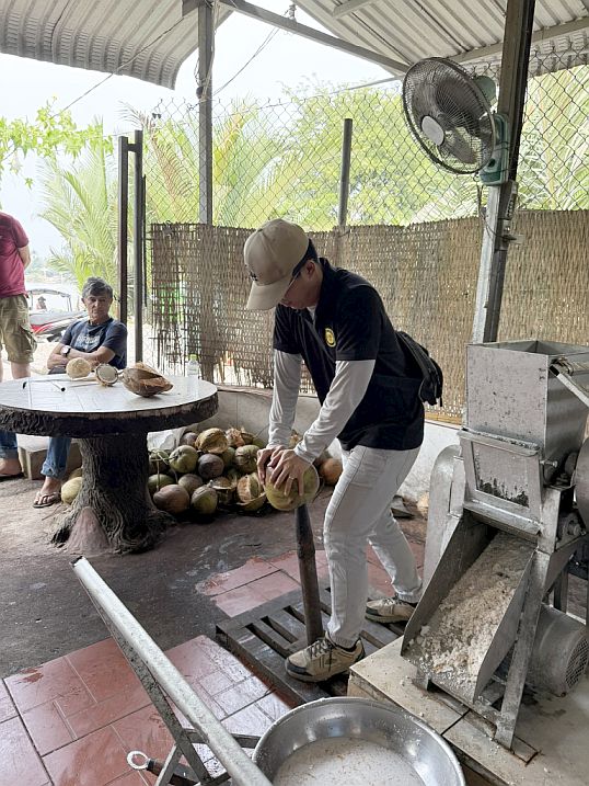 Here, everything becomes hands-on and close-up. Our guide demonstrating how to peel a coconut is the first step in a long traditional process. Using a simple but sharp tool, the thick outer husk is stripped away to reveal the hard inner shell. It’s done quickly and skillfully, showing just how familiar locals are with this fruit, which is such a big part of life in the Mekong Delta.