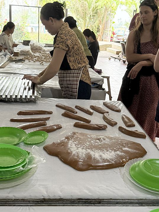 From there, coconuts are used to make the region’s famous keo dua (coconut candy), a sweet, chewy treat made from coconut milk, sugar, and sometimes malt or peanuts.