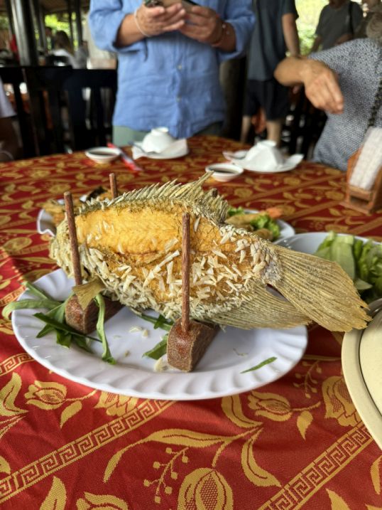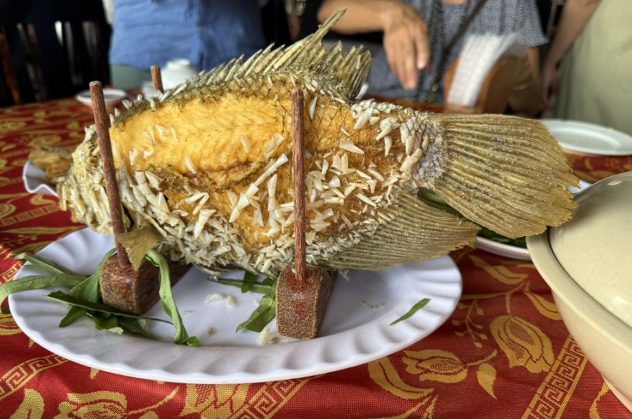 At the table, the highlight is unmistakable, a whole fried fish, deep golden and dramatically presented standing upright, supported by a wooden frame.