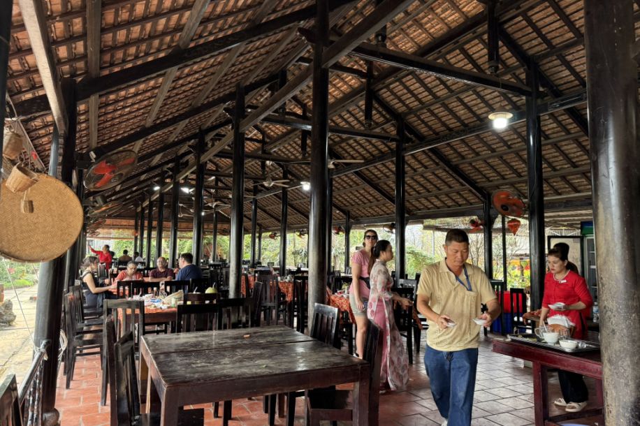The restaurant itself feels spacious yet very much rooted in traditional Mekong Delta design. Built mostly of dark, polished wood, the structure is open and airy. The main dining hall has a high ceiling and is open along the sides, allowing natural light and river breezes to flow through. Thick wooden beams support the roof, adding to the sense of height and openness. It doesn’t feel enclosed like a typical restaurant, instead, it blends into the surrounding landscape, with views of greenery just beyond the open sides.