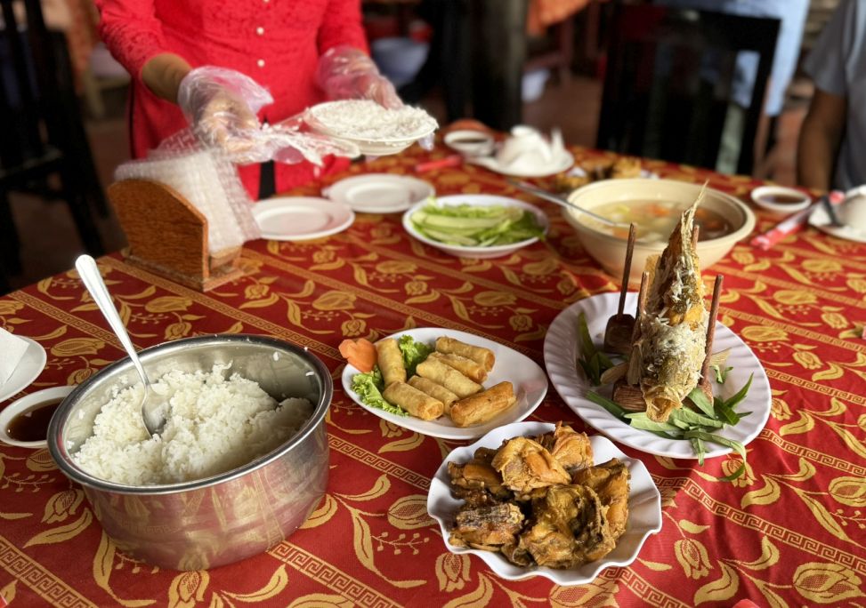 Lunch is waiting for us. Fried golden fish, cha giò (fried spring rolls), crunchy and savory, and fried chicken with steamed rice, simple but comforting dishes that round out the meal.