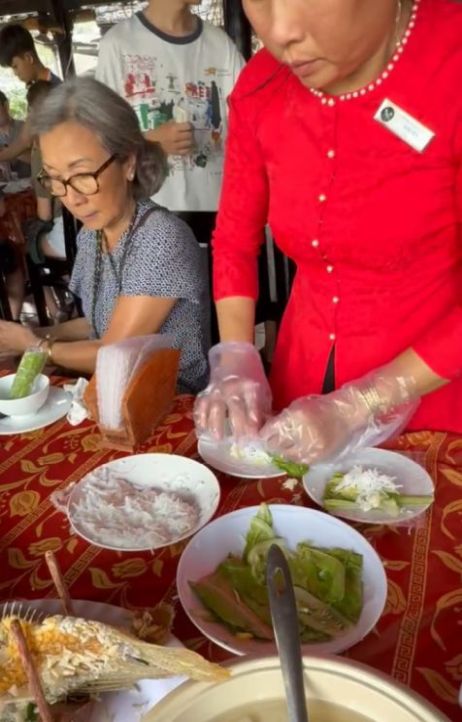Then comes the interactive part: the waitress skillfully takes the fish apart, gently pulling flakes of meat from the crispy body. She places it onto rice paper, layering it with fresh herbs, mint, basil, leafy greens, and pickled vegetables. She then roll it up into a fresh spring roll and gave one to each one of us to dip it into a tangy sauce. It’s a perfect balance of textures, crispy fish, soft rice paper, and fragrant herbs.